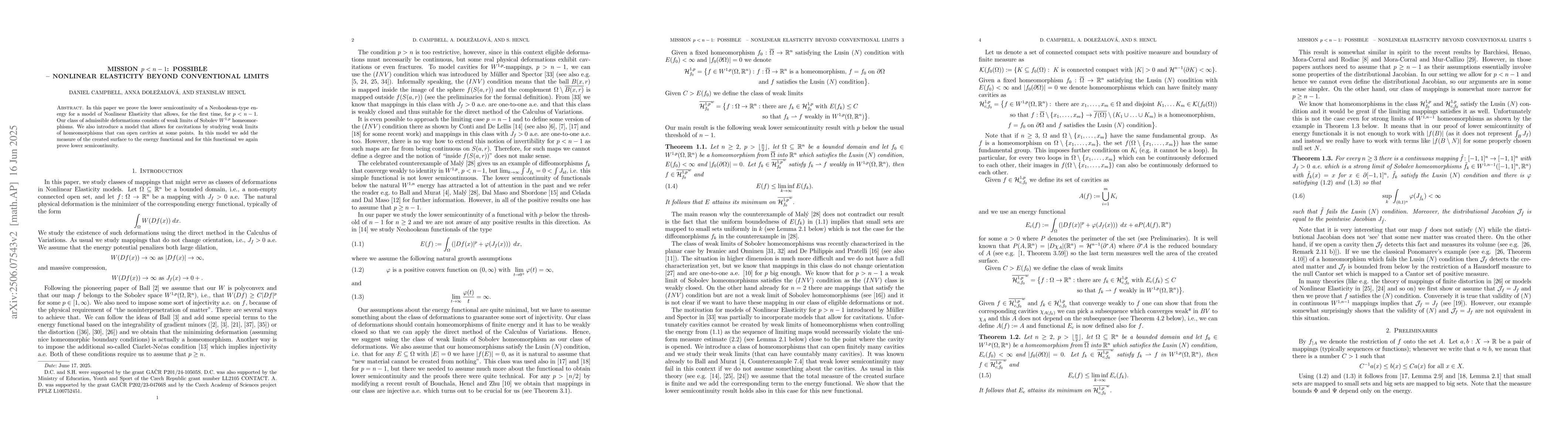 Researchers prove lower semicontinuity of Neohookean-type energy for nonlinear elasticity models with $p<n-1$, allowing cavitations and non-traditional deformations.