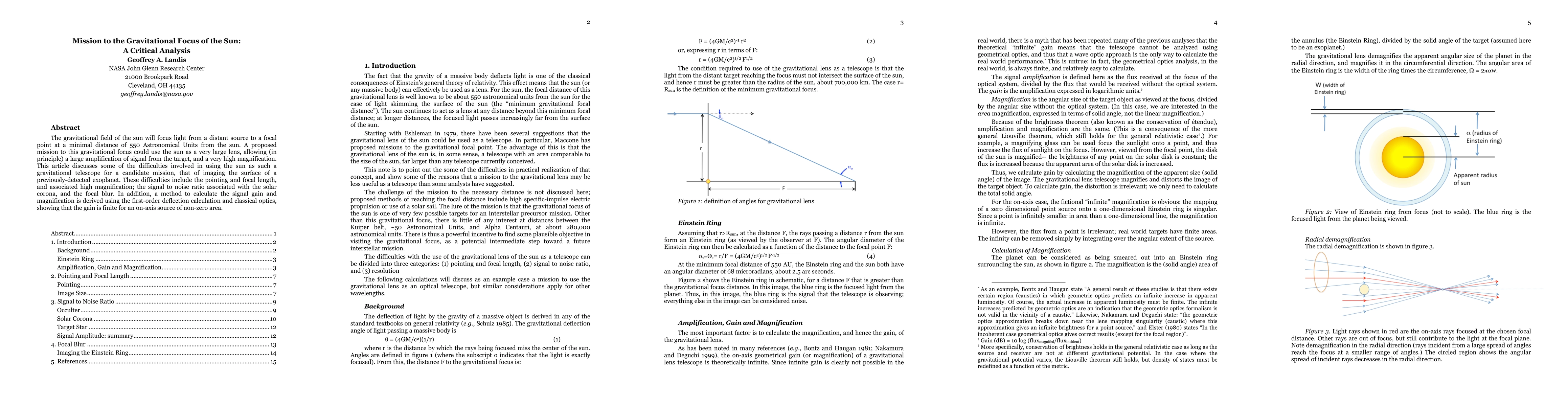 The gravitational field of the sun will focus light from a distant source to a focal point at a minimal distance of 550 Astronomical Units from the sun. A proposed mission to this gravitational focus could use the sun as a very large lens, allowing (in principle) a large amplification of signal from the target, and a very high magnification. This article discusses some of the difficulties involved in using the sun as such a gravitational telescope for a candidate mission, that of imaging the surface of a previously-detected exoplanet. These difficulties include the pointing and focal length, and associated high magnification; the signal to noise ratio associated with the solar corona, and the focal blur. In addition, a method to calculate the signal gain and magnification is derived using the first-order deflection calculation and classical optics, showing that the gain is finite for an on-axis source of non-zero area.