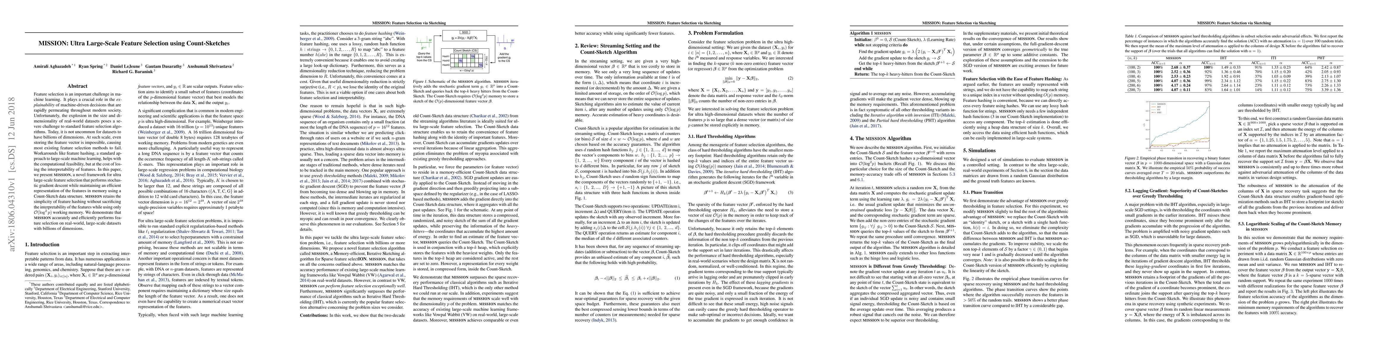 MISSION, a novel framework, uses Count-Sketch data structure to efficiently select features from large-scale datasets, retaining interpretability while using O(log^2(p)) working memory.