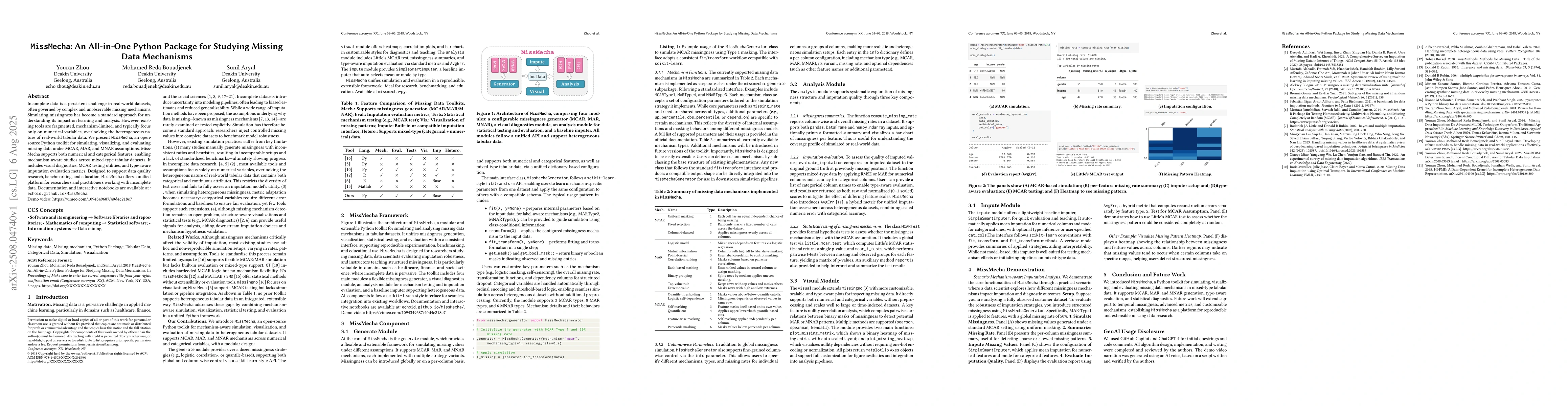 Incomplete data is a persistent challenge in real-world datasets, often governed by complex and unobservable missing mechanisms. Simulating missingness has become a standard approach for understanding its impact on learning and analysis. However, existing tools are fragmented, mechanism-limited, and typically focus only on numerical variables, overlooking the heterogeneous nature of real-world tabular data. We present MissMecha, an open-source Python toolkit for simulating, visualizing, and evaluating missing data under MCAR, MAR, and MNAR assumptions. MissMecha supports both numerical and categorical features, enabling mechanism-aware studies across mixed-type tabular datasets. It includes visual diagnostics, MCAR testing utilities, and type-aware imputation evaluation metrics. Designed to support data quality research, benchmarking, and education,MissMecha offers a unified platform for researchers and practitioners working with incomplete data.