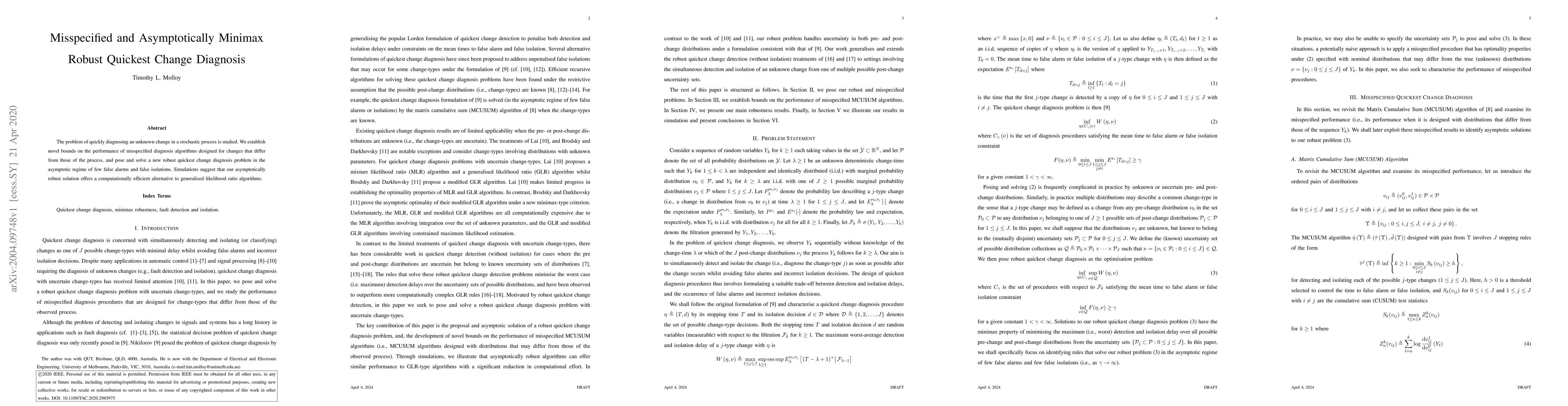 The problem of quickly diagnosing an unknown change in a stochastic process is studied. We establish novel bounds on the performance of misspecified diagnosis algorithms designed for changes that differ from those of the process, and pose and solve a new robust quickest change diagnosis problem in the asymptotic regime of few false alarms and false isolations. Simulations suggest that our asymptotically robust solution offers a computationally efficient alternative to generalised likelihood ratio algorithms.