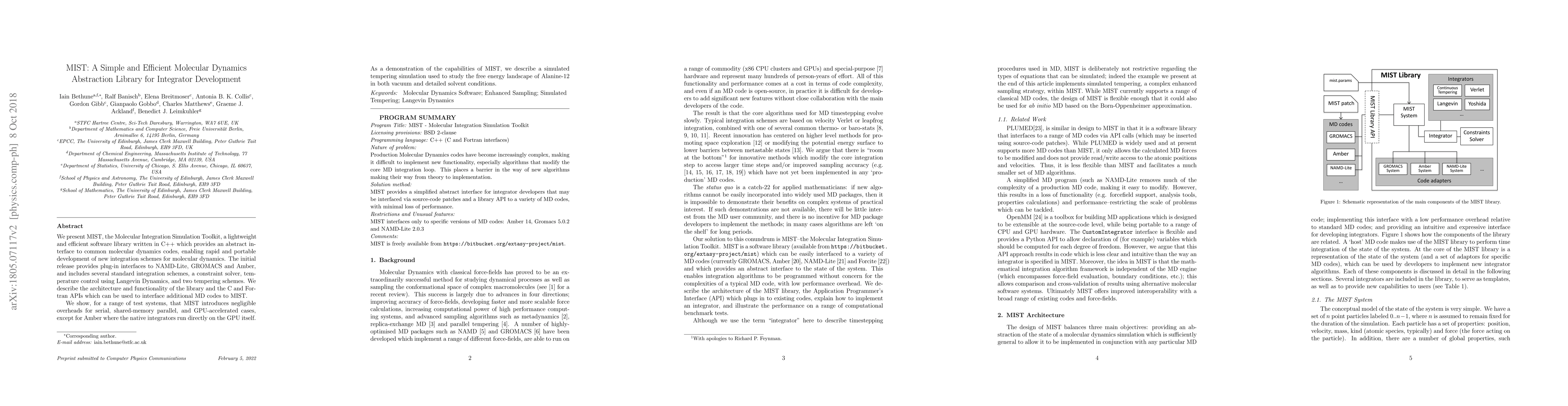 MIST is a lightweight C++ library for developing new integration schemes in molecular dynamics, offering plug-in interfaces to NAMD-Lite, GROMACS, and Amber. It demonstrates negligible overheads across various computational environments and showcases its use in studying the free energy landscape of Alanine-12.