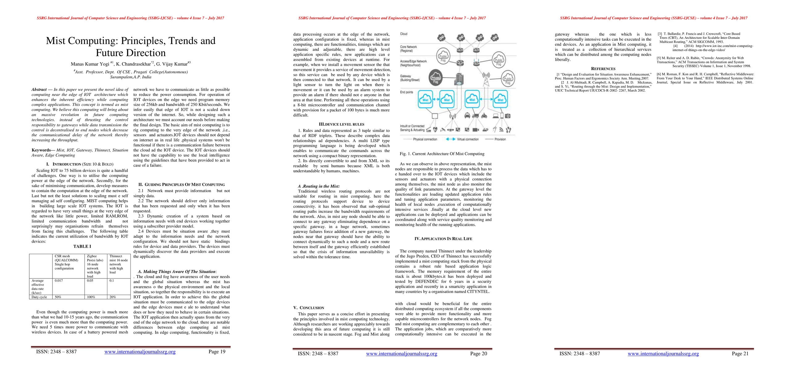 In this paper we present the novel idea of computing near the edge of IOT architecture which enhances the inherent efficiency while computing complex applications. This concept is termed as mist computing. We believe this computing will bring about an massive revolution in future computing technologies. instead of thrusting the control responsibility to gateways while data transmission the control is decentralised to end nodes which decrease the communicational delay of the network thereby increasing the throughput.