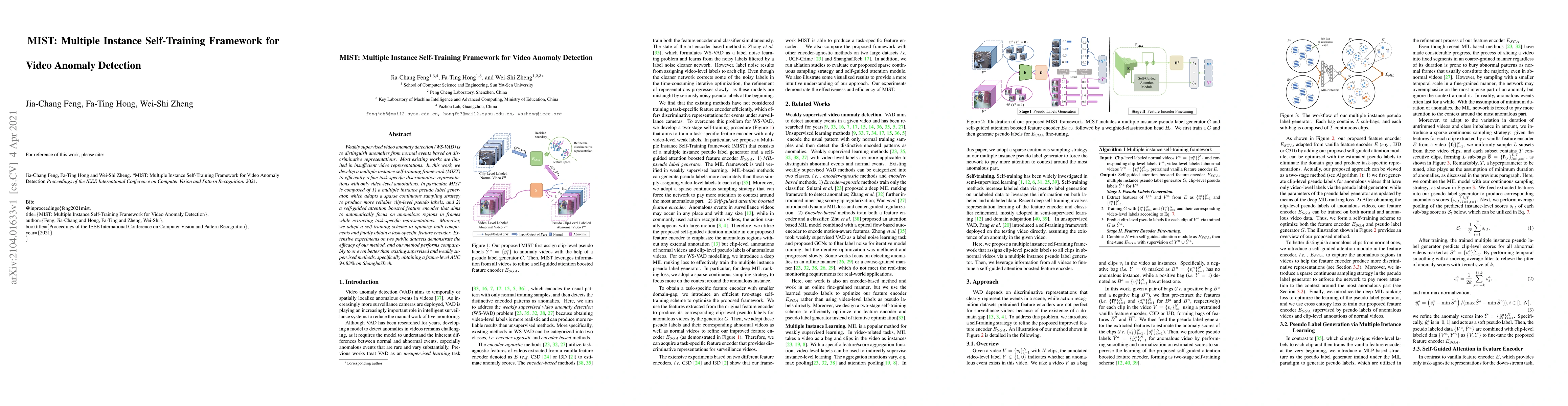 The MIST framework enhances weakly supervised video anomaly detection by refining discriminative representations using video-level annotations. It employs a pseudo label generator and a self-guided attention feature encoder, achieving competitive performance with an AUC of 94.83% on ShanghaiTech.