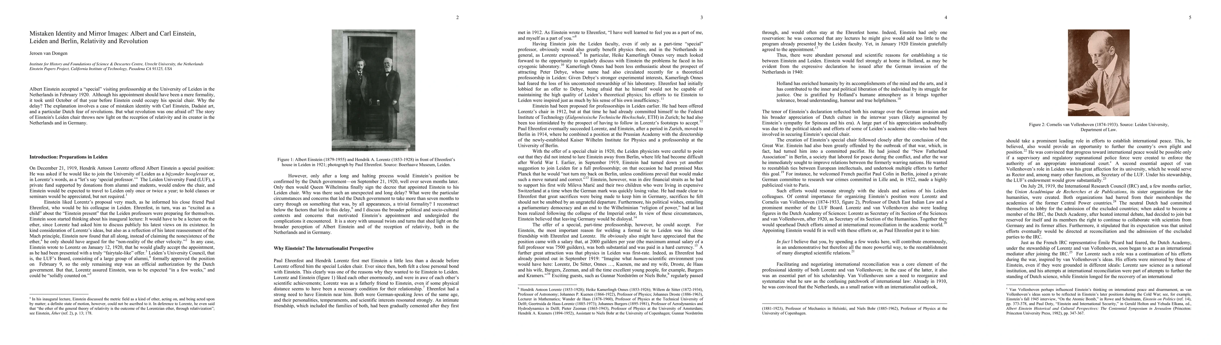 Albert Einstein accepted a 'special' visiting professorship at the University of Leiden in the Netherlands in February 1920. Although his appointment should have been a mere formality, it took until October of that year before Einstein could occupy his special chair. Why the delay? The explanation involves a case of mistaken identity with Carl Einstein, Dadaist art, and a particular Dutch fear of revolutions. But what revolution was one afraid of? The story of Einstein's Leiden chair throws new light on the reception of relativity and its creator in the Netherlands and in Germany.