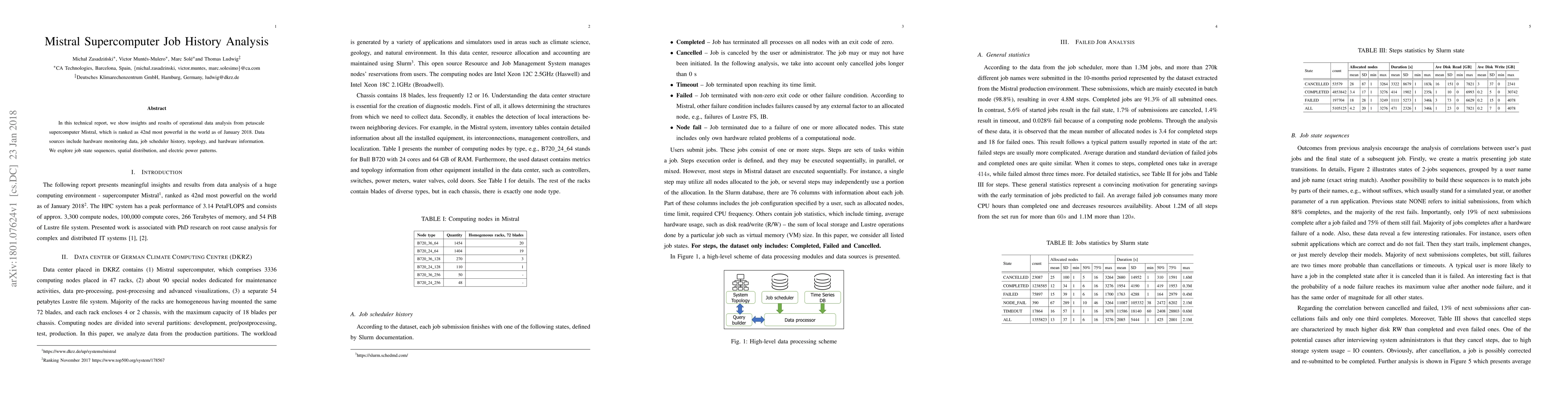 This technical report analyzes operational data from Mistral supercomputer, focusing on job state sequences, spatial distribution, and electric power patterns derived from hardware monitoring, job scheduler history, and topology data. Insights reveal significant trends and operational efficiencies.