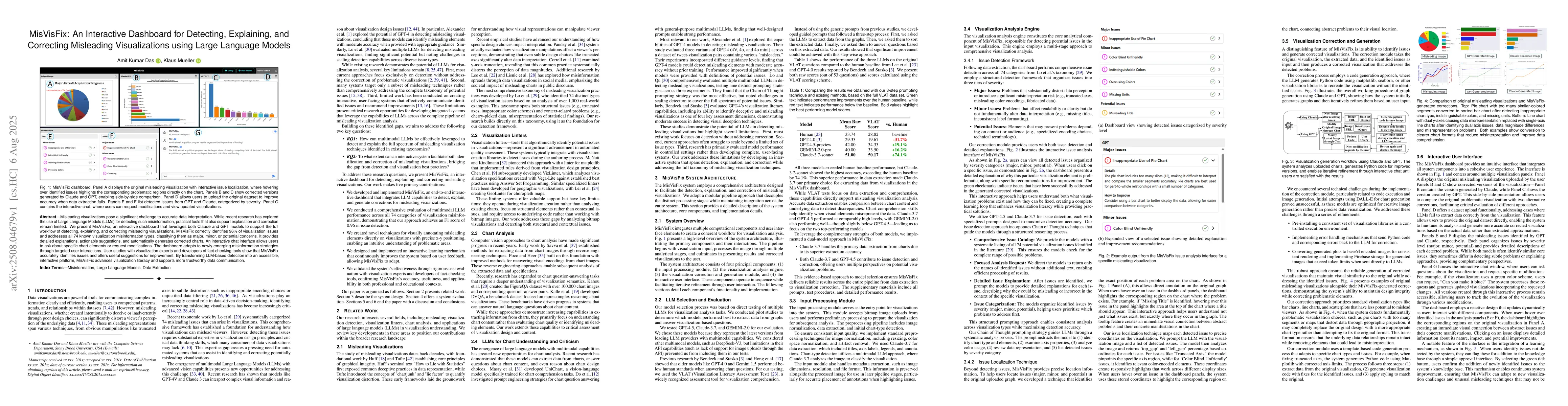 Misleading visualizations pose a significant challenge to accurate data interpretation. While recent research has explored the use of Large Language Models (LLMs) for detecting such misinformation, practical tools that also support explanation and correction remain limited. We present MisVisFix, an interactive dashboard that leverages both Claude and GPT models to support the full workflow of detecting, explaining, and correcting misleading visualizations. MisVisFix correctly identifies 96% of visualization issues and addresses all 74 known visualization misinformation types, classifying them as major, minor, or potential concerns. It provides detailed explanations, actionable suggestions, and automatically generates corrected charts. An interactive chat interface allows users to ask about specific chart elements or request modifications. The dashboard adapts to newly emerging misinformation strategies through targeted user interactions. User studies with visualization experts and developers of fact-checking tools show that MisVisFix accurately identifies issues and offers useful suggestions for improvement. By transforming LLM-based detection into an accessible, interactive platform, MisVisFix advances visualization literacy and supports more trustworthy data communication.
