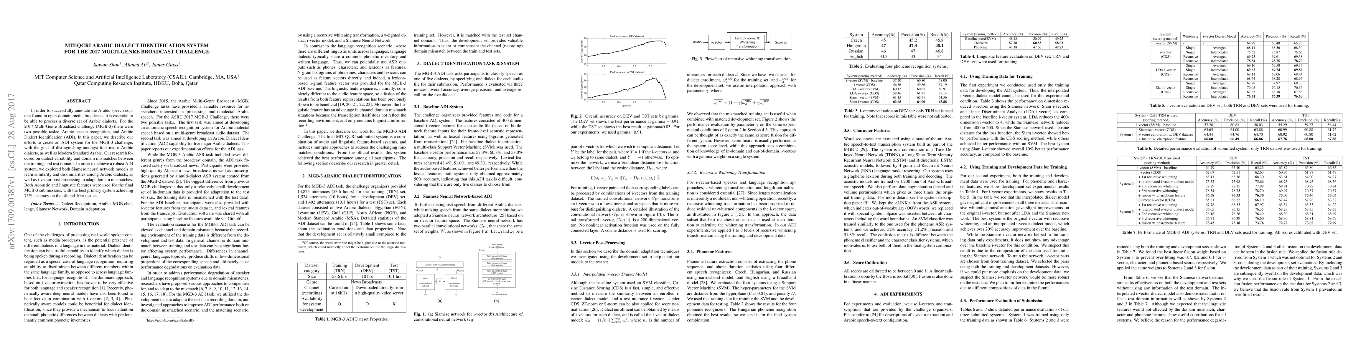 This paper presents an Arabic Dialect Identification (ADI) system developed for the 2017 Multi-Genre Broadcast challenge, achieving 75% accuracy on distinguishing four major Arabic dialects and Modern Standard Arabic. The system uses Siamese neural networks and i-vector post-processing to handle dialect variability and domain mismatches.