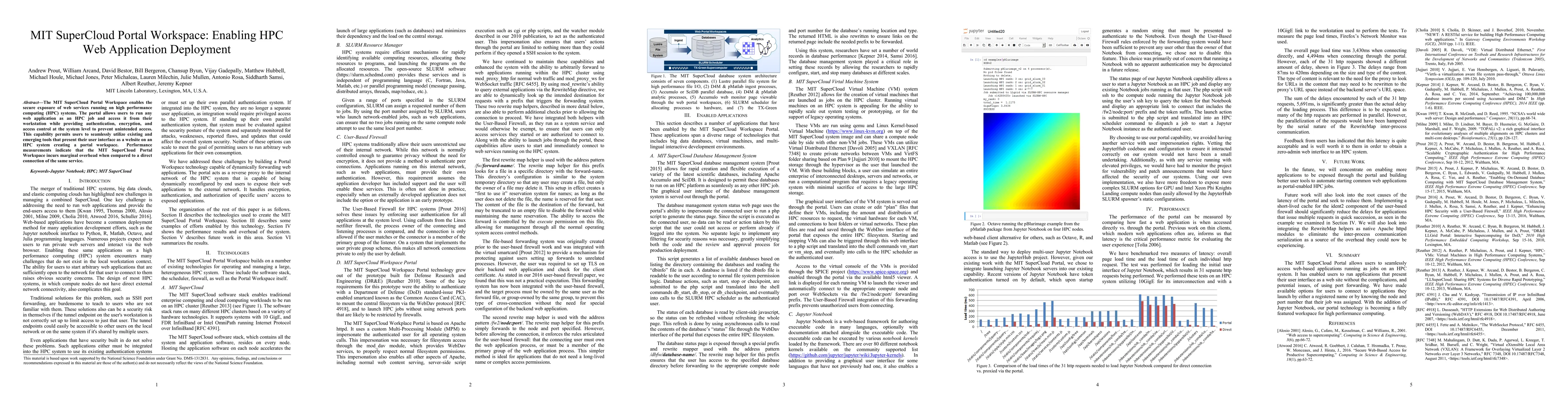 The MIT SuperCloud Portal Workspace facilitates secure web application deployment on HPC systems, allowing users to run web apps as HPC jobs with robust authentication and encryption. Performance tests show minimal overhead compared to direct service connections.