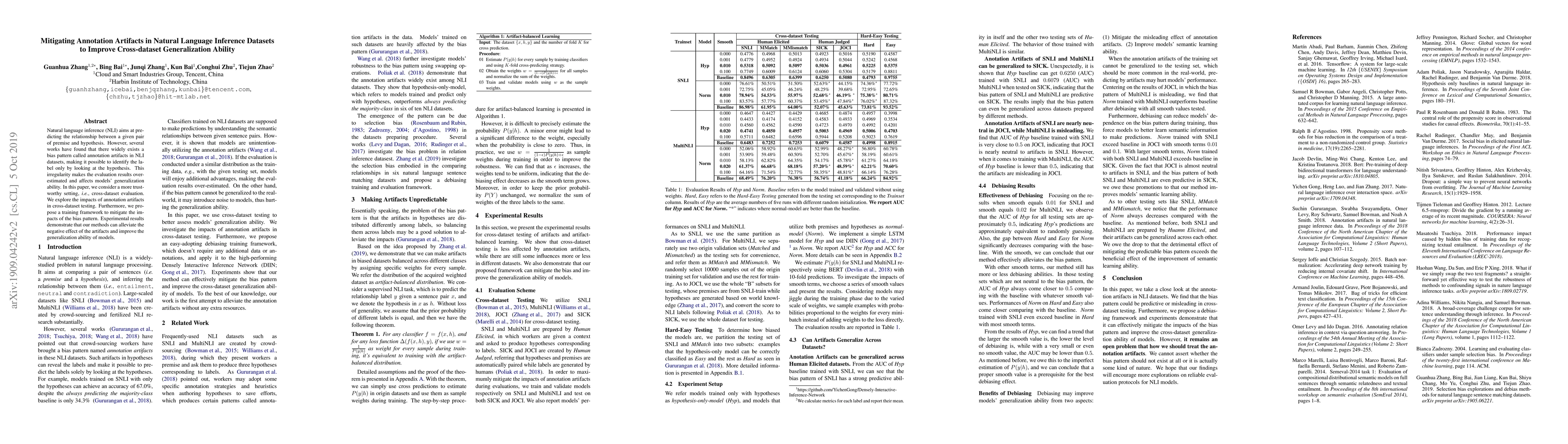 This paper investigates the bias known as annotation artifacts in Natural Language Inference datasets, which skew evaluation results and hinder model generalization. It proposes a training framework to mitigate these biases, demonstrating improved cross-dataset performance and generalization ability.