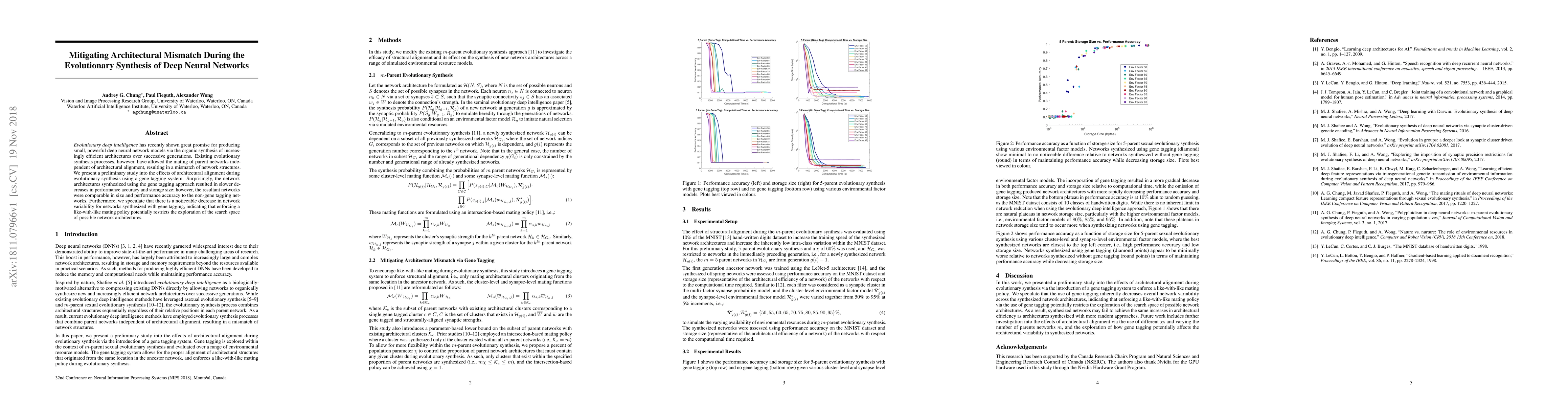 This paper investigates the impact of architectural alignment during evolutionary synthesis of deep neural networks, proposing a gene tagging system to enforce structural compatibility. The study finds that while gene tagging leads to slower performance and size degradation, it results in networks with comparable accuracy and size, and reduced variability, suggesting a limitation in architectural exploration.