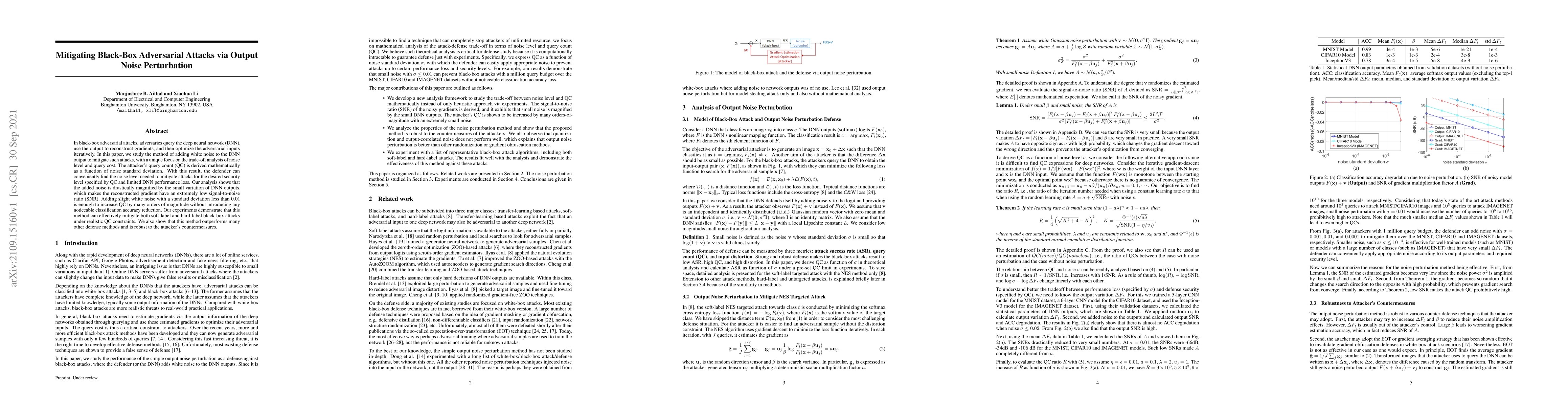 This paper proposes adding white noise to the output of a deep neural network (DNN) to mitigate black-box adversarial attacks, analyzing the trade-off between noise level and query cost. The method significantly increases the query count required for attackers while maintaining classification accuracy, demonstrating effectiveness against both soft-label and hard-label attacks.