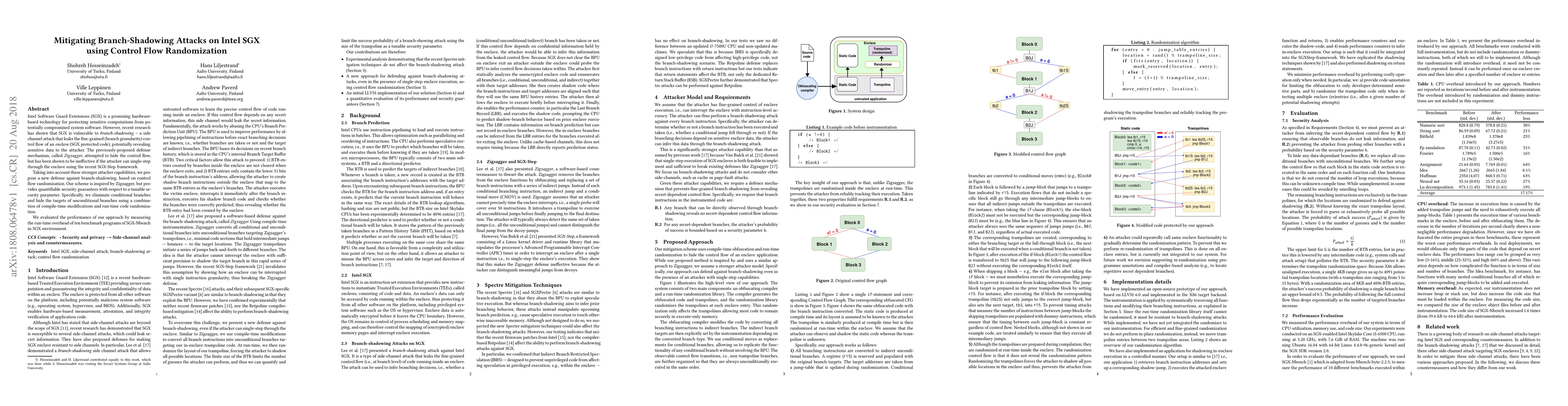 This paper proposes a new defense mechanism against branch-shadowing attacks on Intel SGX by using control flow randomization, addressing the limitations of the previous Zigzagger method. The scheme eliminates conditional branches and hides unconditional branch targets through compile-time modifications and runtime code randomization, providing quantifiable security guarantees.