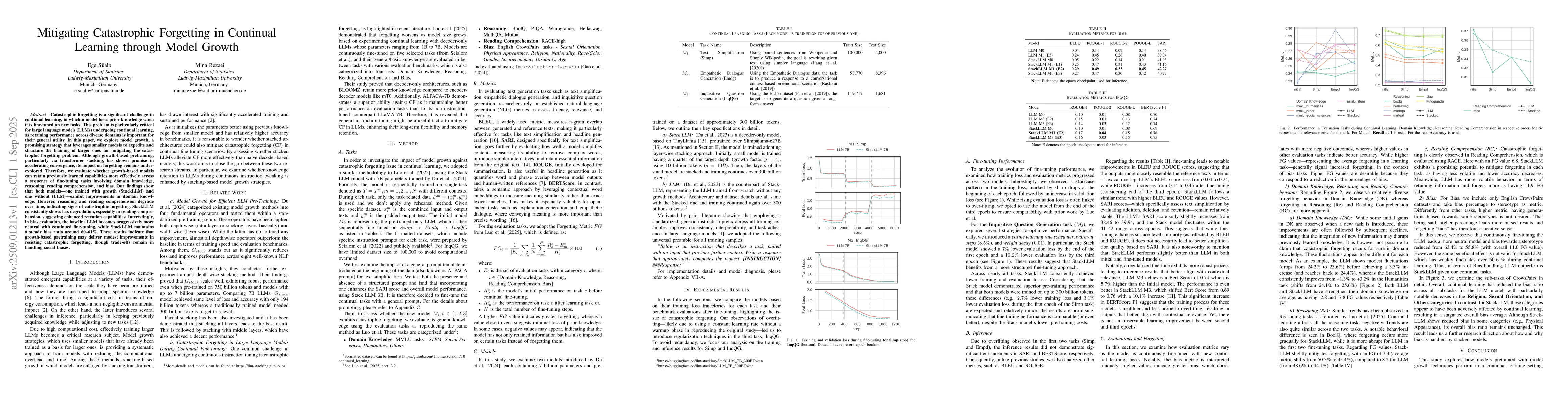Catastrophic forgetting is a significant challenge in continual learning, in which a model loses prior knowledge when it is fine-tuned on new tasks. This problem is particularly critical for large language models (LLMs) undergoing continual learning, as retaining performance across diverse domains is important for their general utility. In this paper, we explore model growth, a promising strategy that leverages smaller models to expedite and structure the training of larger ones for mitigating the catastrophic forgetting problem. Although growth-based pretraining, particularly via transformer stacking, has shown promise in accelerating convergence, its impact on forgetting remains under-explored. Therefore, we evaluate whether growth-based models can retain previously learned capabilities more effectively across a sequence of fine-tuning tasks involving domain knowledge, reasoning, reading comprehension, and bias. Our findings show that both models -- one trained with growth (Stack LLM) and one without (LLM) -- exhibit improvements in domain knowledge. However, reasoning and reading comprehension degrade over time, indicating signs of catastrophic forgetting. Stack LLM consistently shows less degradation, especially in reading comprehension, suggesting enhanced retention capabilities. Interestingly, in bias evaluation, the baseline LLM becomes progressively more neutral with continued fine-tuning, while Stack LLM maintains a steady bias ratio around 60--61\%. These results indicate that growth-based pretraining may deliver modest improvements in resisting catastrophic forgetting, though trade-offs remain in handling social biases.