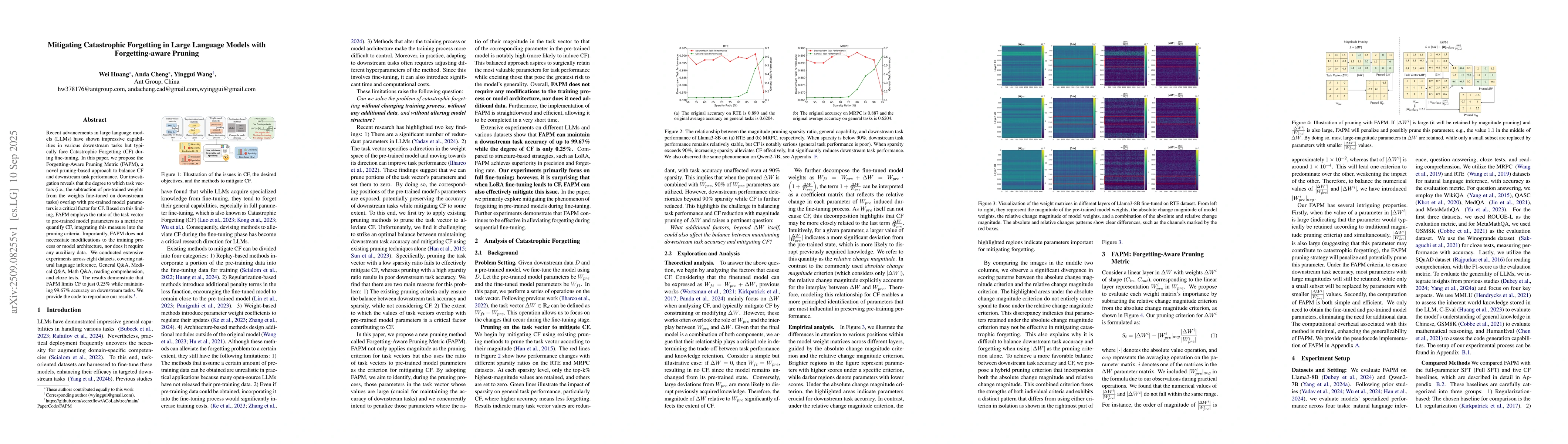Recent advancements in large language models (LLMs) have shown impressive capabilities in various downstream tasks but typically face Catastrophic Forgetting (CF) during fine-tuning. In this paper, we propose the Forgetting-Aware Pruning Metric (FAPM), a novel pruning-based approach to balance CF and downstream task performance. Our investigation reveals that the degree to which task vectors (i.e., the subtraction of pre-trained weights from the weights fine-tuned on downstream tasks) overlap with pre-trained model parameters is a critical factor for CF. Based on this finding, FAPM employs the ratio of the task vector to pre-trained model parameters as a metric to quantify CF, integrating this measure into the pruning criteria. Importantly, FAPM does not necessitate modifications to the training process or model architecture, nor does it require any auxiliary data. We conducted extensive experiments across eight datasets, covering natural language inference, General Q&A, Medical Q&A, Math Q&A, reading comprehension, and cloze tests. The results demonstrate that FAPM limits CF to just 0.25\% while maintaining 99.67\% accuracy on downstream tasks. We provide the code to reproduce our results.