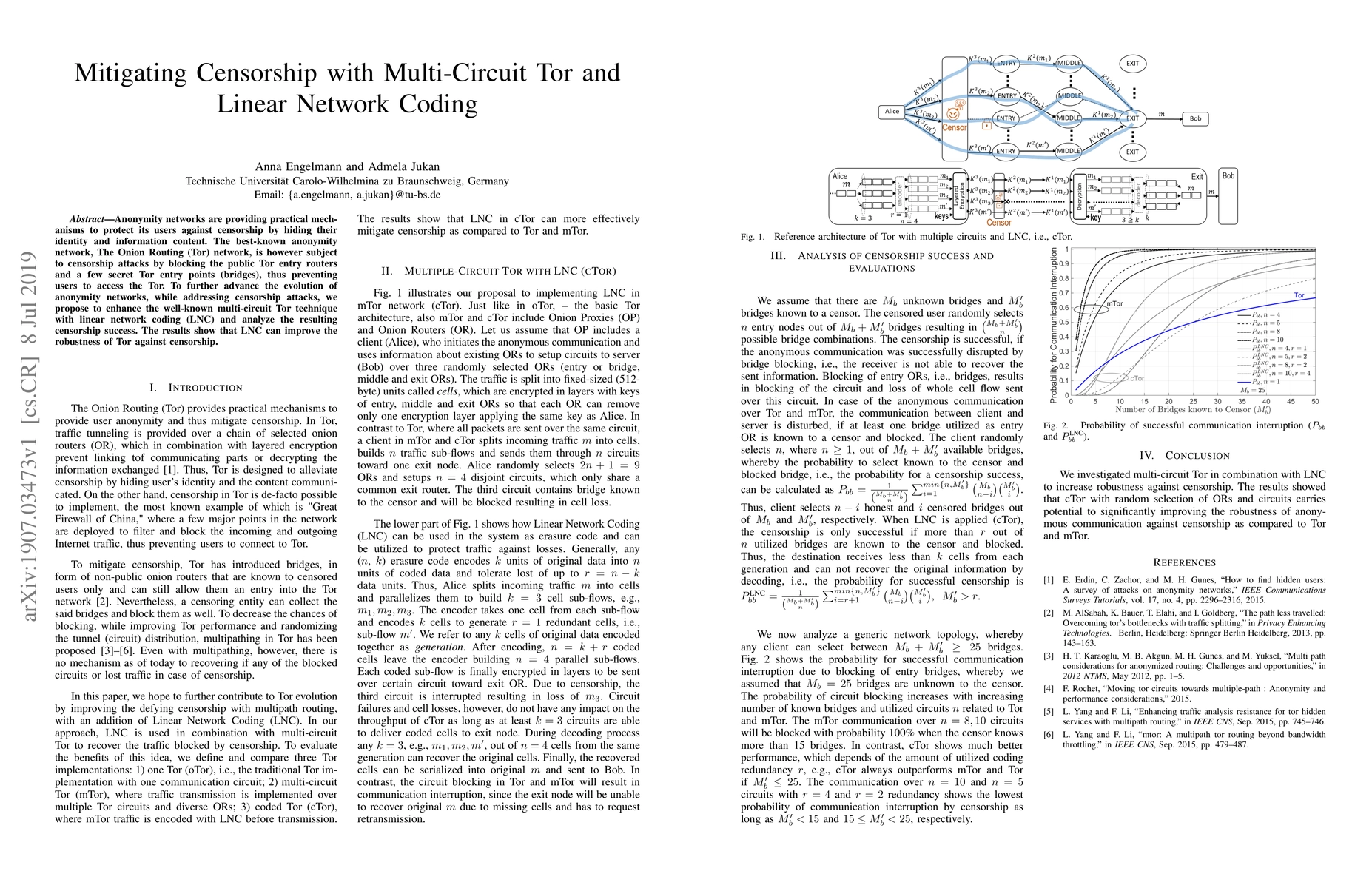 This paper proposes enhancing the multi-circuit Tor network with linear network coding to improve its robustness against censorship attacks. The integration of linear network coding is shown to effectively mitigate censorship by blocking public and secret Tor entry points.