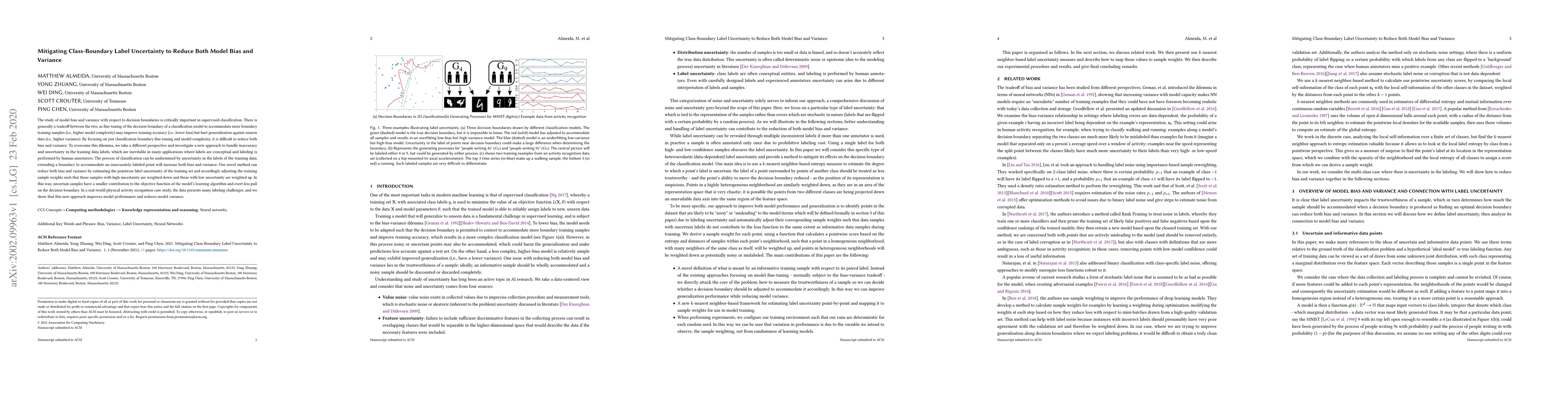 The study of model bias and variance with respect to decision boundaries is critically important in supervised classification. There is generally a tradeoff between the two, as fine-tuning of the decision boundary of a classification model to accommodate more boundary training samples (i.e., higher model complexity) may improve training accuracy (i.e., lower bias) but hurt generalization against unseen data (i.e., higher variance). By focusing on just classification boundary fine-tuning and model complexity, it is difficult to reduce both bias and variance. To overcome this dilemma, we take a different perspective and investigate a new approach to handle inaccuracy and uncertainty in the training data labels, which are inevitable in many applications where labels are conceptual and labeling is performed by human annotators. The process of classification can be undermined by uncertainty in the labels of the training data; extending a boundary to accommodate an inaccurately labeled point will increase both bias and variance. Our novel method can reduce both bias and variance by estimating the pointwise label uncertainty of the training set and accordingly adjusting the training sample weights such that those samples with high uncertainty are weighted down and those with low uncertainty are weighted up. In this way, uncertain samples have a smaller contribution to the objective function of the model's learning algorithm and exert less pull on the decision boundary. In a real-world physical activity recognition case study, the data presents many labeling challenges, and we show that this new approach improves model performance and reduces model variance.