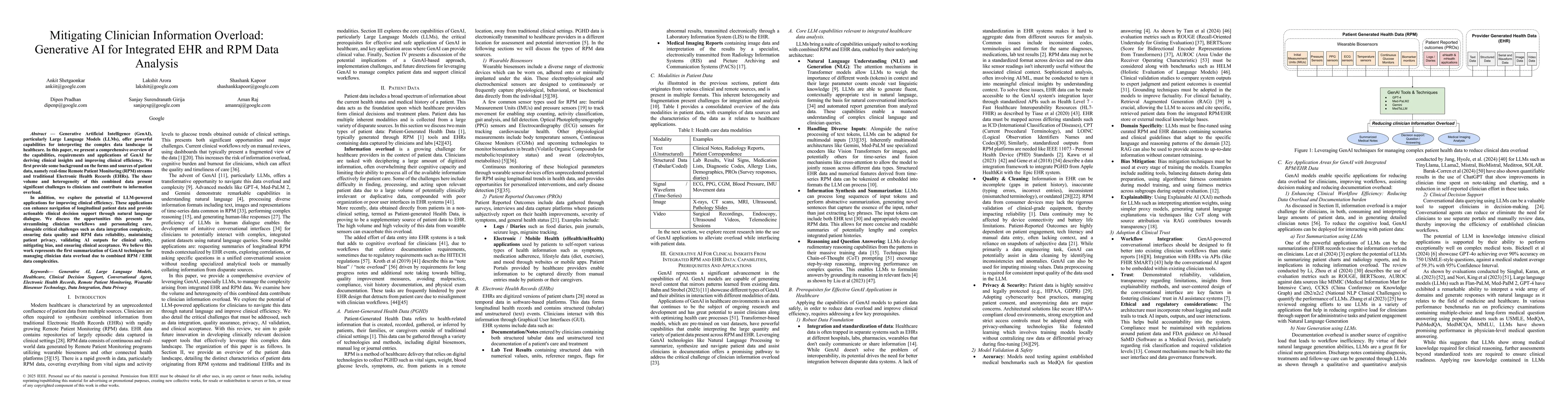Generative Artificial Intelligence (GenAI), particularly Large Language Models (LLMs), offer powerful capabilities for interpreting the complex data landscape in healthcare. In this paper, we present a comprehensive overview of the capabilities, requirements and applications of GenAI for deriving clinical insights and improving clinical efficiency. We first provide some background on the forms and sources of patient data, namely real-time Remote Patient Monitoring (RPM) streams and traditional Electronic Health Records (EHRs). The sheer volume and heterogeneity of this combined data present significant challenges to clinicians and contribute to information overload. In addition, we explore the potential of LLM-powered applications for improving clinical efficiency. These applications can enhance navigation of longitudinal patient data and provide actionable clinical decision support through natural language dialogue. We discuss the opportunities this presents for streamlining clinician workflows and personalizing care, alongside critical challenges such as data integration complexity, ensuring data quality and RPM data reliability, maintaining patient privacy, validating AI outputs for clinical safety, mitigating bias, and ensuring clinical acceptance. We believe this work represents the first summarization of GenAI techniques for managing clinician data overload due to combined RPM / EHR data complexities.