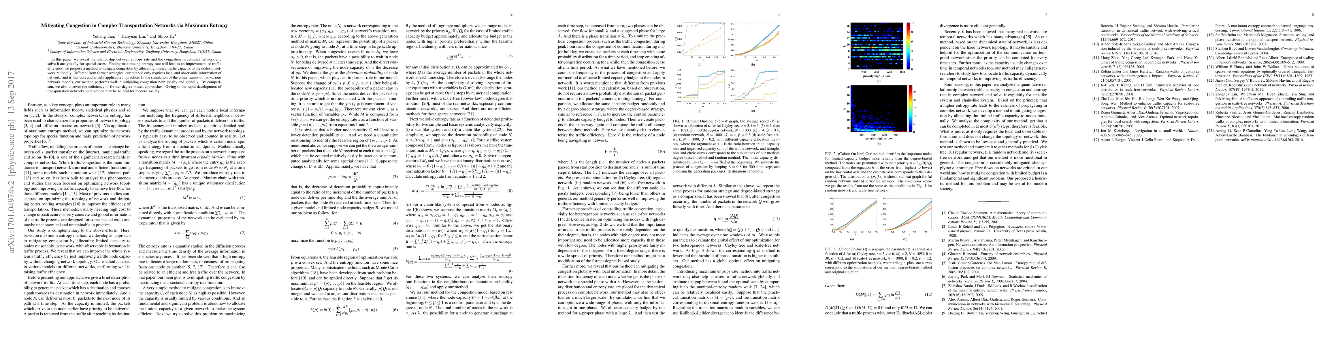 This paper proposes a method to mitigate congestion in complex transportation networks using maximum entropy, which improves traffic efficiency with low-cost and widely applicable solutions.