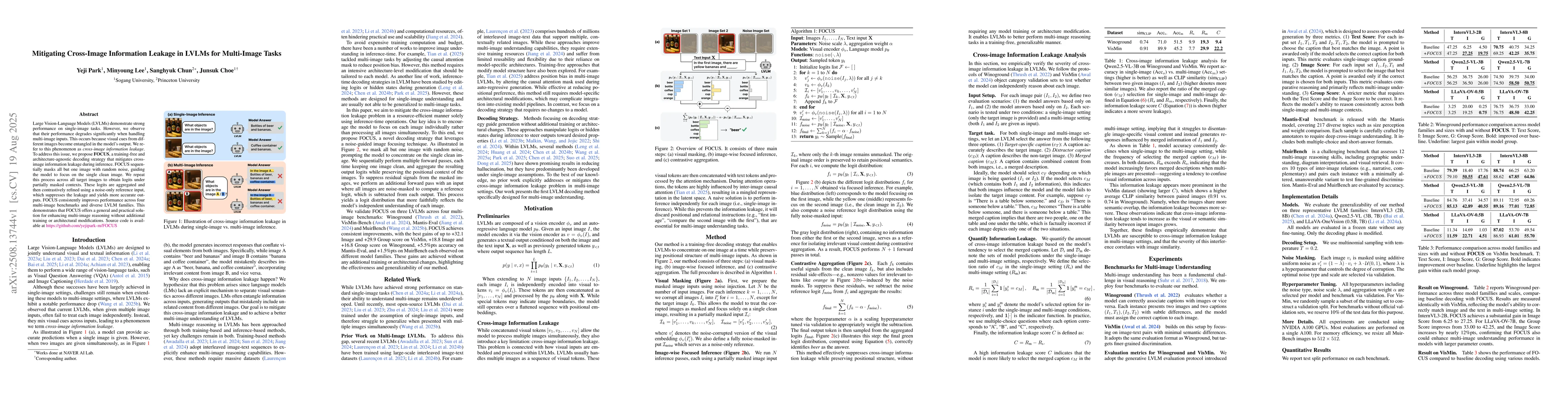 Large Vision-Language Models (LVLMs) demonstrate strong performance on single-image tasks. However, we observe that their performance degrades significantly when handling multi-image inputs. This occurs because visual cues from different images become entangled in the model's output. We refer to this phenomenon as cross-image information leakage. To address this issue, we propose FOCUS, a training-free and architecture-agnostic decoding strategy that mitigates cross-image information leakage during inference. FOCUS sequentially masks all but one image with random noise, guiding the model to focus on the single clean image. We repeat this process across all target images to obtain logits under partially masked contexts. These logits are aggregated and then contrastively refined using a noise-only reference input, which suppresses the leakage and yields more accurate outputs. FOCUS consistently improves performance across four multi-image benchmarks and diverse LVLM families. This demonstrates that FOCUS offers a general and practical solution for enhancing multi-image reasoning without additional training or architectural modifications.