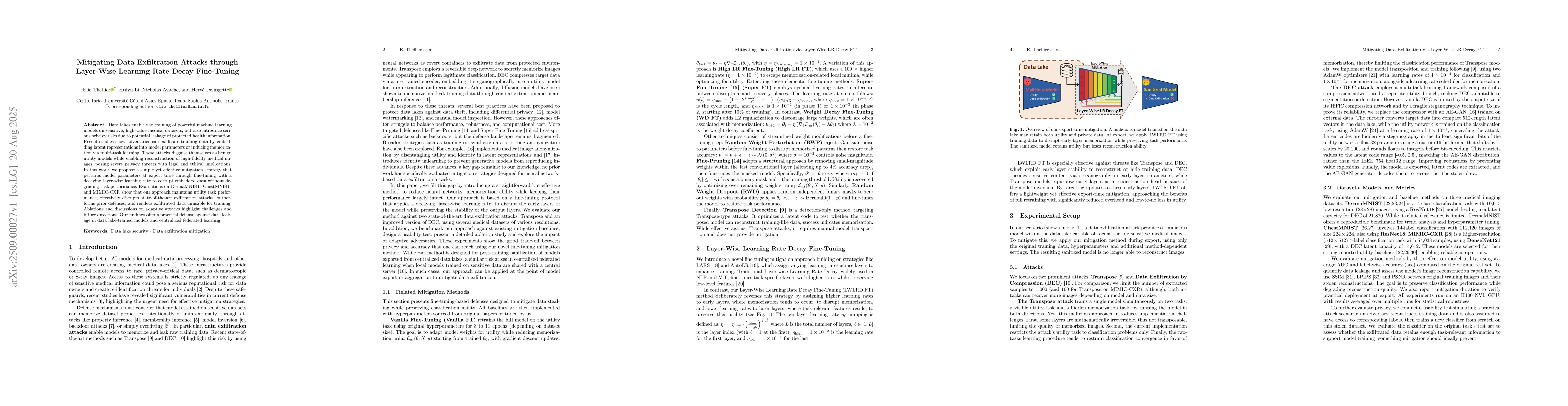 Data lakes enable the training of powerful machine learning models on sensitive, high-value medical datasets, but also introduce serious privacy risks due to potential leakage of protected health information. Recent studies show adversaries can exfiltrate training data by embedding latent representations into model parameters or inducing memorization via multi-task learning. These attacks disguise themselves as benign utility models while enabling reconstruction of high-fidelity medical images, posing severe privacy threats with legal and ethical implications. In this work, we propose a simple yet effective mitigation strategy that perturbs model parameters at export time through fine-tuning with a decaying layer-wise learning rate to corrupt embedded data without degrading task performance. Evaluations on DermaMNIST, ChestMNIST, and MIMIC-CXR show that our approach maintains utility task performance, effectively disrupts state-of-the-art exfiltration attacks, outperforms prior defenses, and renders exfiltrated data unusable for training. Ablations and discussions on adaptive attacks highlight challenges and future directions. Our findings offer a practical defense against data leakage in data lake-trained models and centralized federated learning.