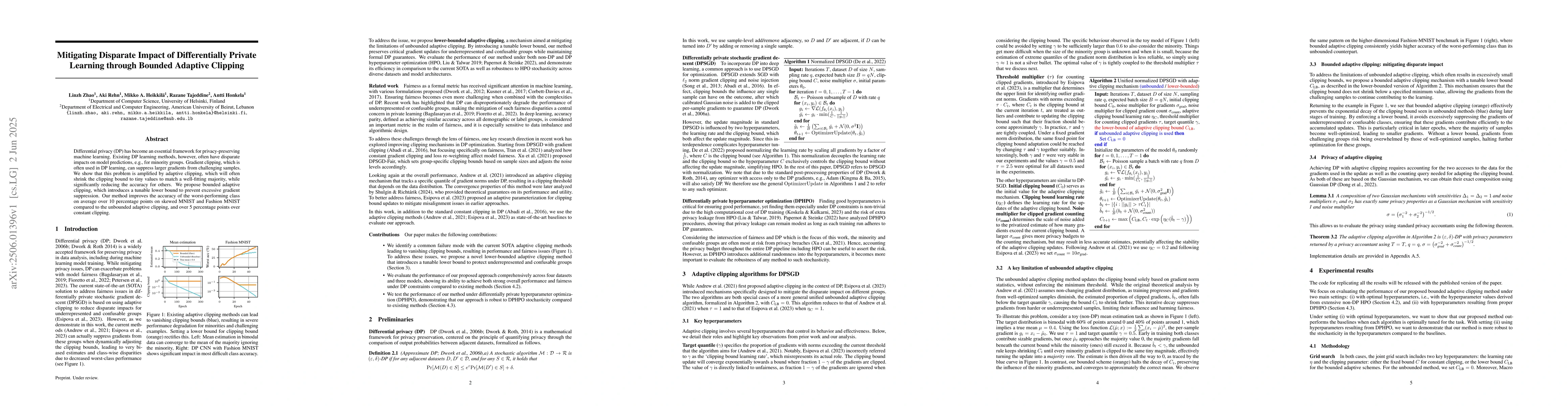 Differential privacy (DP) has become an essential framework for privacy-preserving machine learning. Existing DP learning methods, however, often have disparate impacts on model predictions, e.g., for minority groups. Gradient clipping, which is often used in DP learning, can suppress larger gradients from challenging samples. We show that this problem is amplified by adaptive clipping, which will often shrink the clipping bound to tiny values to match a well-fitting majority, while significantly reducing the accuracy for others. We propose bounded adaptive clipping, which introduces a tunable lower bound to prevent excessive gradient suppression. Our method improves the accuracy of the worst-performing class on average over 10 percentage points on skewed MNIST and Fashion MNIST compared to the unbounded adaptive clipping, and over 5 percentage points over constant clipping.