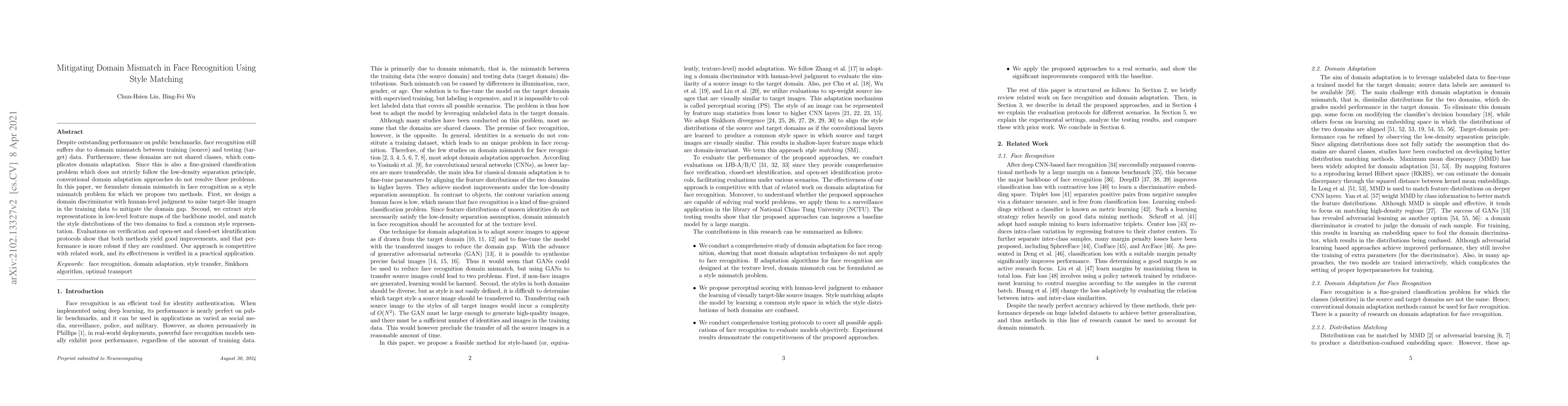 Despite outstanding performance on public benchmarks, face recognition still suffers due to domain mismatch between training (source) and testing (target) data. Furthermore, these domains are not shared classes, which complicates domain adaptation. Since this is also a fine-grained classification problem which does not strictly follow the low-density separation principle, conventional domain adaptation approaches do not resolve these problems. In this paper, we formulate domain mismatch in face recognition as a style mismatch problem for which we propose two methods. First, we design a domain discriminator with human-level judgment to mine target-like images in the training data to mitigate the domain gap. Second, we extract style representations in low-level feature maps of the backbone model, and match the style distributions of the two domains to find a common style representation. Evaluations on verification and open-set and closed-set identification protocols show that both methods yield good improvements, and that performance is more robust if they are combined. Our approach is competitive with related work, and its effectiveness is verified in a practical application.