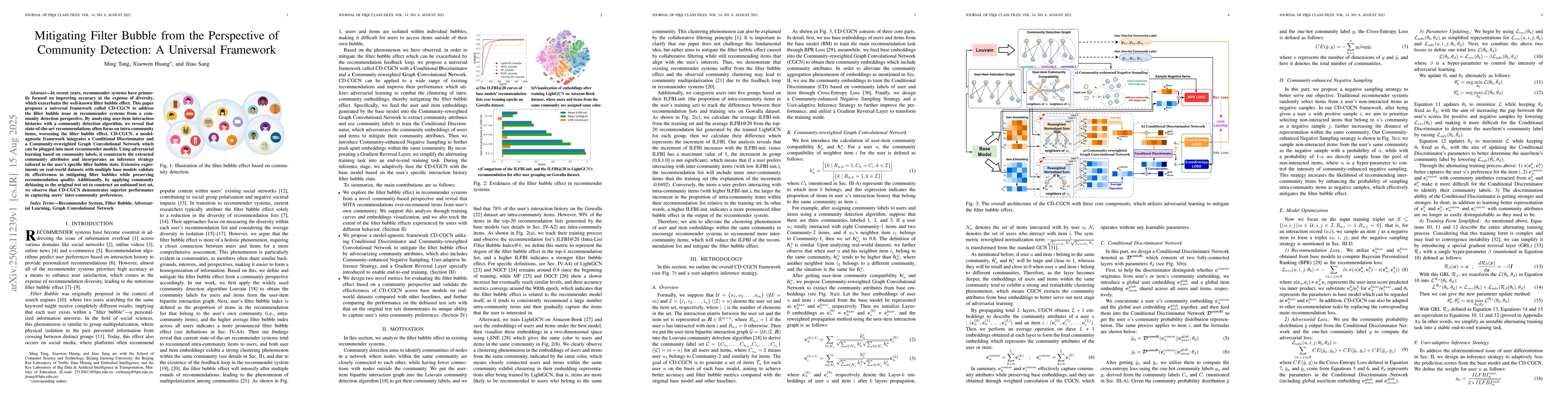 In recent years, recommender systems have primarily focused on improving accuracy at the expense of diversity, which exacerbates the well-known filter bubble effect. This paper proposes a universal framework called CD-CGCN to address the filter bubble issue in recommender systems from a community detection perspective. By analyzing user-item interaction histories with a community detection algorithm, we reveal that state-of-the-art recommendations often focus on intra-community items, worsening the filter bubble effect. CD-CGCN, a model-agnostic framework, integrates a Conditional Discriminator and a Community-reweighted Graph Convolutional Network which can be plugged into most recommender models. Using adversarial learning based on community labels, it counteracts the extracted community attributes and incorporates an inference strategy tailored to the user's specific filter bubble state. Extensive experiments on real-world datasets with multiple base models validate its effectiveness in mitigating filter bubbles while preserving recommendation quality. Additionally, by applying community debiasing to the original test set to construct an unbiased test set, we observe that CD-CGCN demonstrates superior performance in capturing users' inter-community preferences.