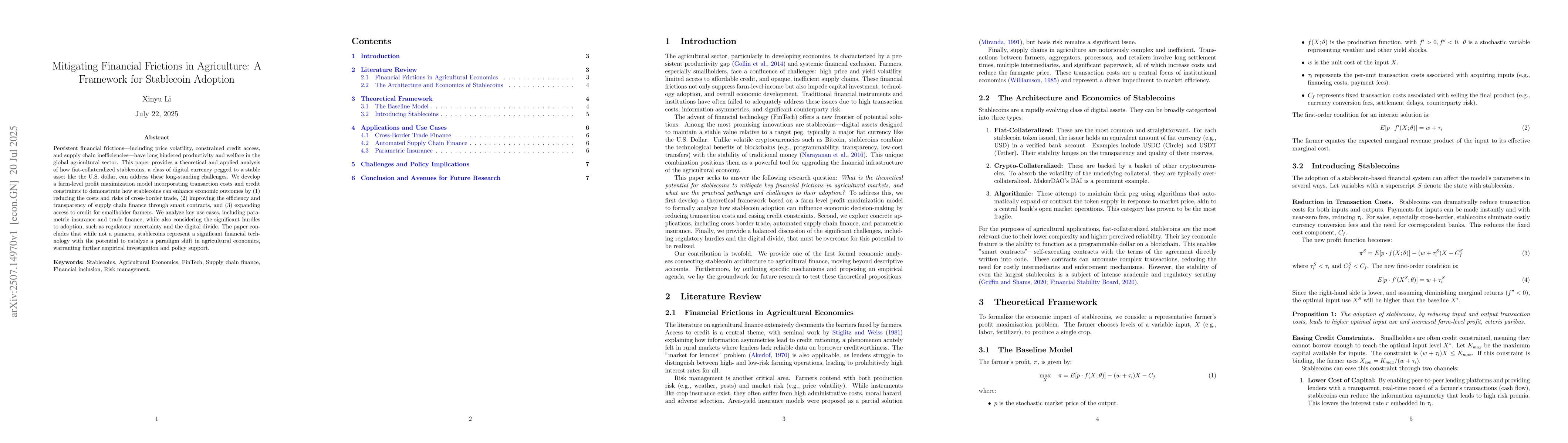 Persistent financial frictions - including price volatility, constrained credit access, and supply chain inefficiencies - have long hindered productivity and welfare in the global agricultural sector. This paper provides a theoretical and applied analysis of how fiat-collateralized stablecoins, a class of digital currency pegged to a stable asset like the U.S. dollar, can address these long-standing challenges. We develop a farm-level profit maximization model incorporating transaction costs and credit constraints to demonstrate how stablecoins can enhance economic outcomes by (1) reducing the costs and risks of cross-border trade, (2) improving the efficiency and transparency of supply chain finance through smart contracts, and (3) expanding access to credit for smallholder farmers. We analyze key use cases, including parametric insurance and trade finance, while also considering the significant hurdles to adoption, such as regulatory uncertainty and the digital divide. The paper concludes that while not a panacea, stablecoins represent a significant financial technology with the potential to catalyze a paradigm shift in agricultural economics, warranting further empirical investigation and policy support.