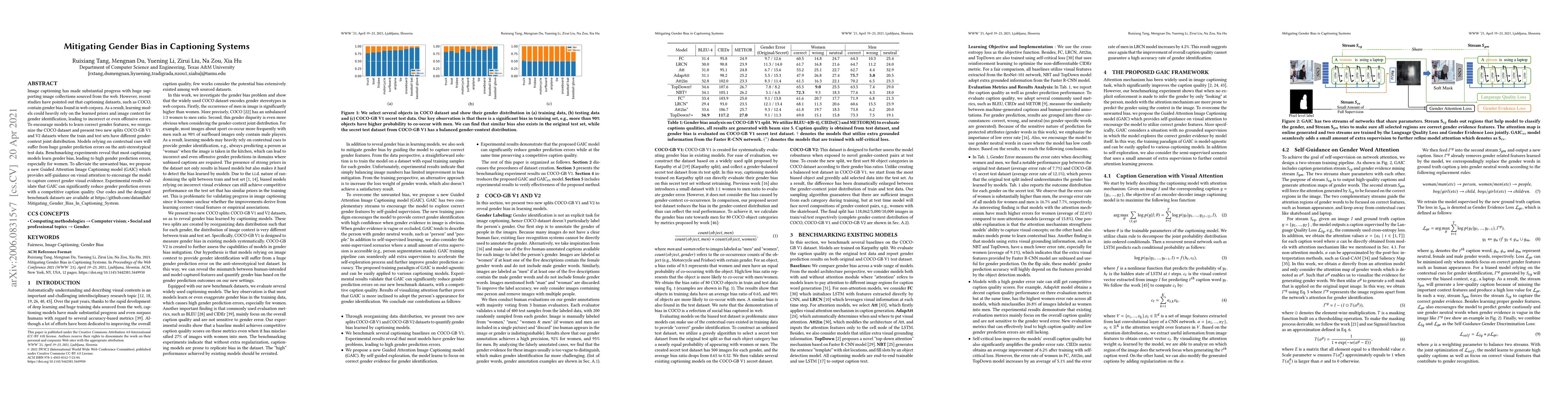 This paper addresses gender bias in image captioning systems by reorganizing the COCO dataset into new splits, COCO-GB V1 and V2, to challenge models' reliance on gender stereotypes. It introduces a Guided Attention Image Captioning model (GAIC) that reduces gender prediction errors, demonstrating improved performance with competitive caption quality.