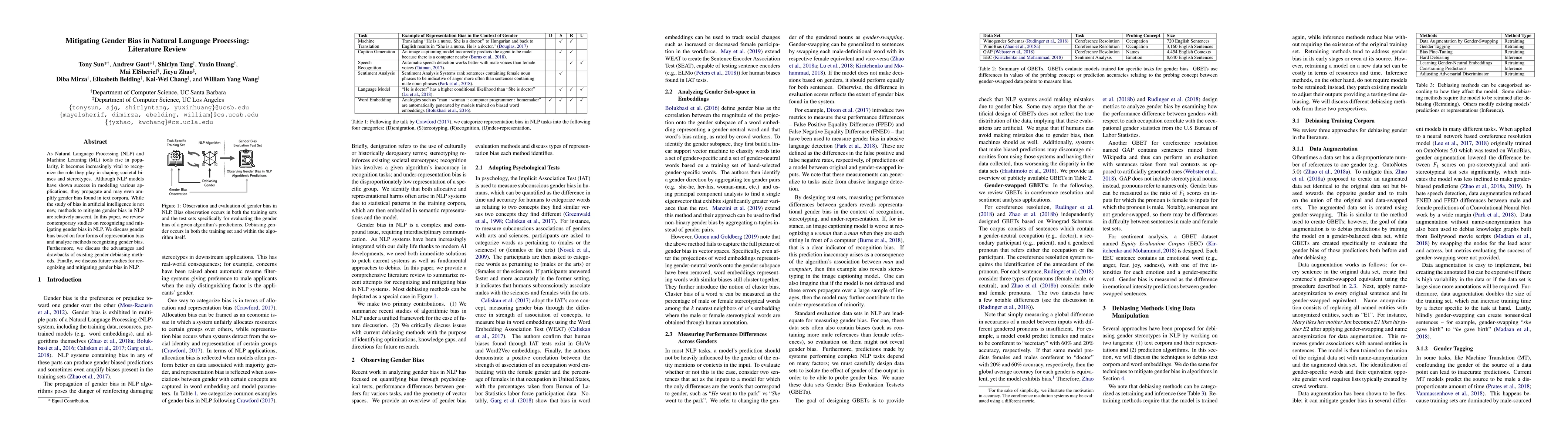 This paper reviews contemporary studies on recognizing and mitigating gender bias in Natural Language Processing (NLP), discussing methods for identifying and addressing bias based on four forms of representation bias, and analyzing the pros and cons of existing debiasing techniques. It also outlines future research directions in this area.