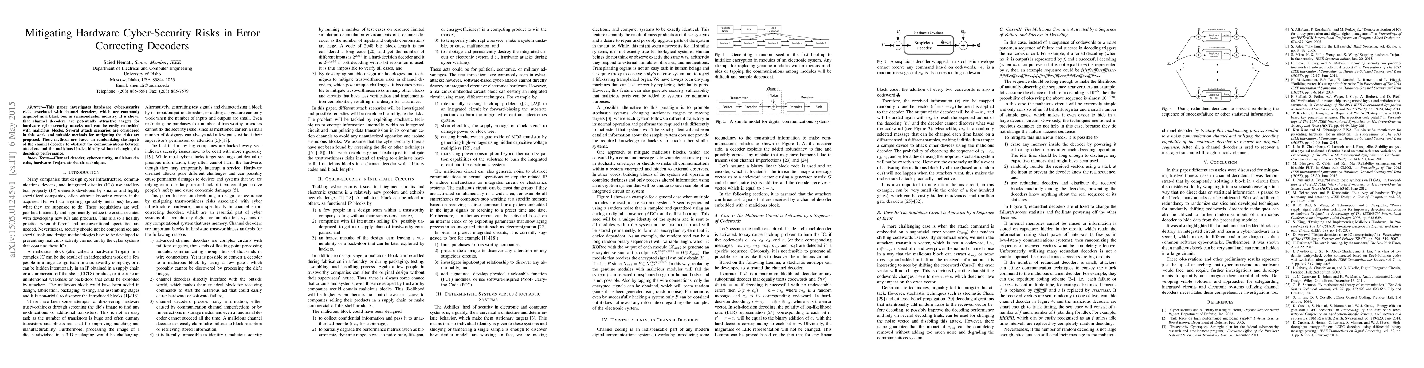 This paper investigates hardware cyber-security risks associated with channel decoders, which are commonly acquired as a black box in semiconductor industry. It is shown that channel decoders are potentially attractive targets for hardware cyber-security attacks and can be easily embedded with malicious blocks. Several attack scenarios are considered in this work and suitable methods for mitigating the risks are proposed. These methods are based on randomizing the inputs of the channel decoder to obstruct the communications between attackers and the malicious blocks, ideally without changing the decoding performance.