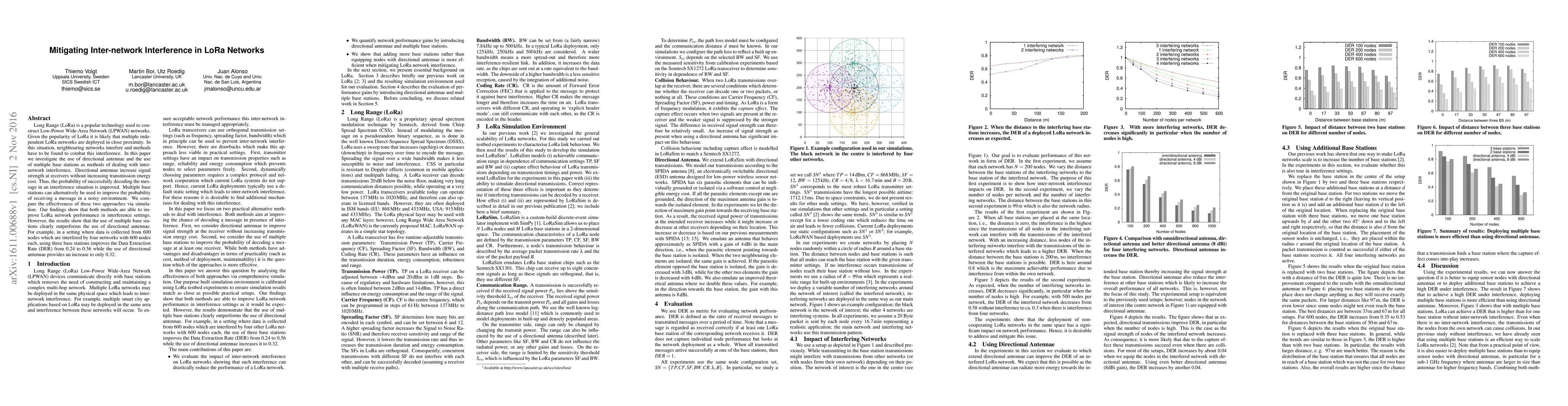 This paper investigates methods to mitigate inter-network interference in LoRa networks, focusing on directional antennae and multiple base stations. Simulation results show that while both methods improve performance, multiple base stations significantly outperform directional antennae, increasing the Data Extraction Rate from 0.24 to 0.56 compared to 0.32 with directional antennae.