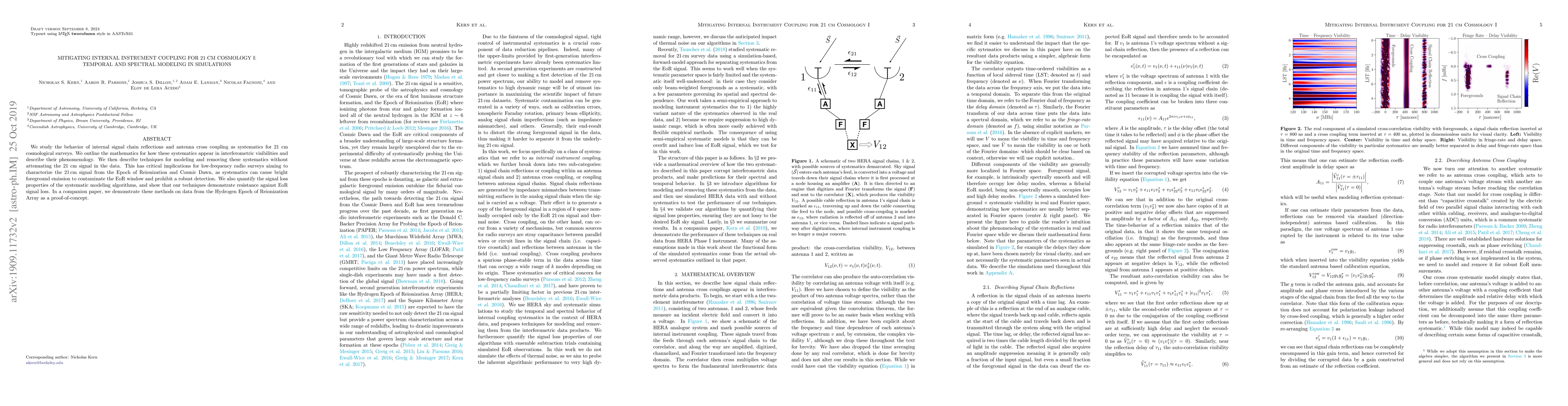 We study the behavior of internal signal chain reflections and antenna cross coupling as systematics for 21 cm cosmological surveys. We outline the mathematics for how these systematics appear in interferometric visibilities and describe their phenomenology. We then describe techniques for modeling and removing these systematics without attenuating the 21 cm signal in the data. This has critical implications for low-frequency radio surveys aiming to characterize the 21cm signal from the Epoch of Reionization and Cosmic Dawn, as systematics can cause bright foreground emission to contaminate the EoR window and prohibit a robust detection. We also quantify the signal loss properties of the systematic modeling algorithms, and show that our techniques demonstrate resistance against EoR signal loss. In a companion paper, we demonstrate these methods on data from the Hydrogen Epoch of Reionization Array as a proof-of-concept.