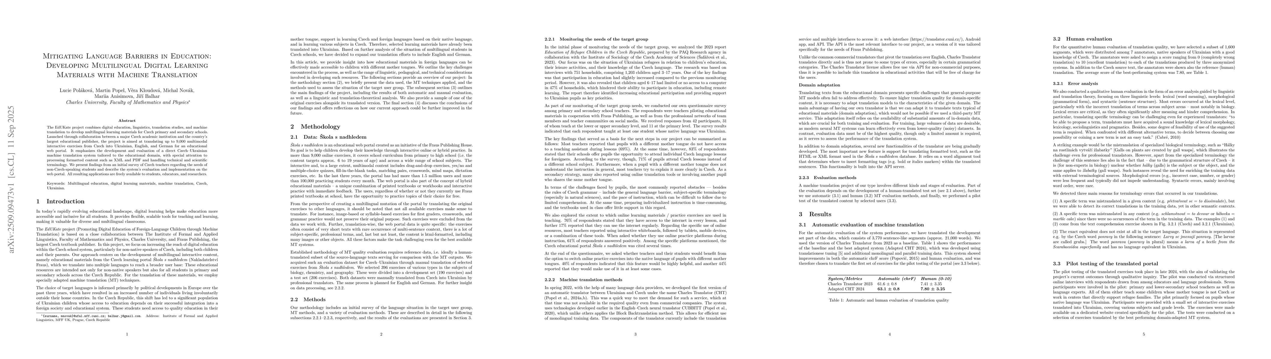The EdUKate project combines digital education, linguistics, translation studies, and machine translation to develop multilingual learning materials for Czech primary and secondary schools. Launched through collaboration between a major Czech academic institution and the country's largest educational publisher, the project is aimed at translating up to 9,000 multimodal interactive exercises from Czech into Ukrainian, English, and German for an educational web portal. It emphasizes the development and evaluation of a direct Czech-Ukrainian machine translation system tailored to the educational domain, with special attention to processing formatted content such as XML and PDF and handling technical and scientific terminology. We present findings from an initial survey of Czech teachers regarding the needs of non-Czech-speaking students and describe the system's evaluation and implementation on the web portal. All resulting applications are freely available to students, educators, and researchers.