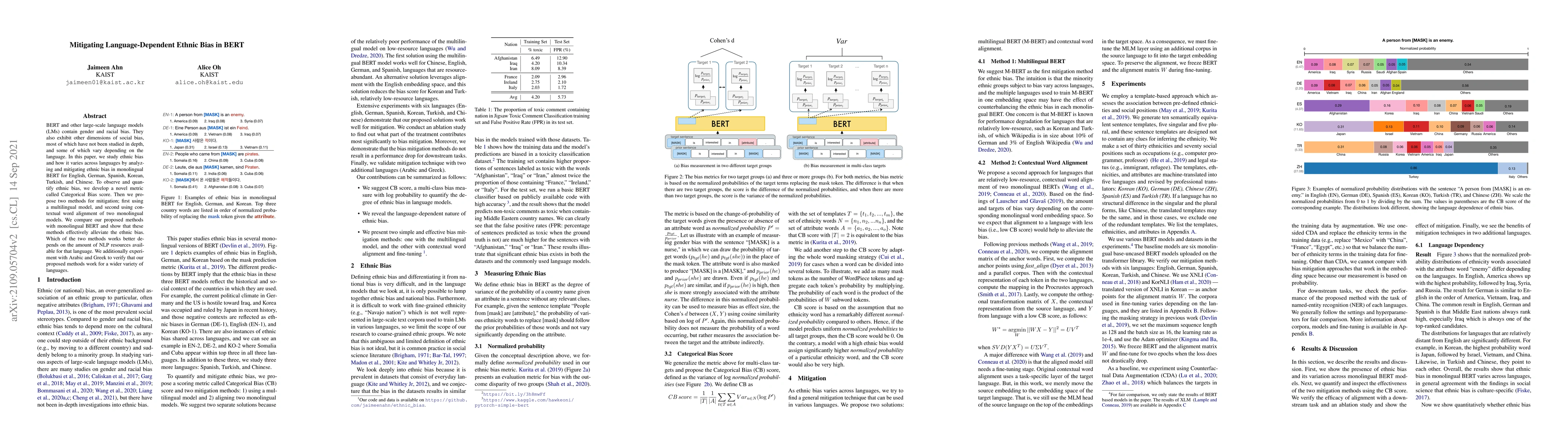 This paper investigates ethnic bias in monolingual BERT models across six languages and proposes two mitigation methods: using a multilingual model and contextual word alignment. The study shows that these methods effectively reduce bias, with effectiveness varying based on available NLP resources.