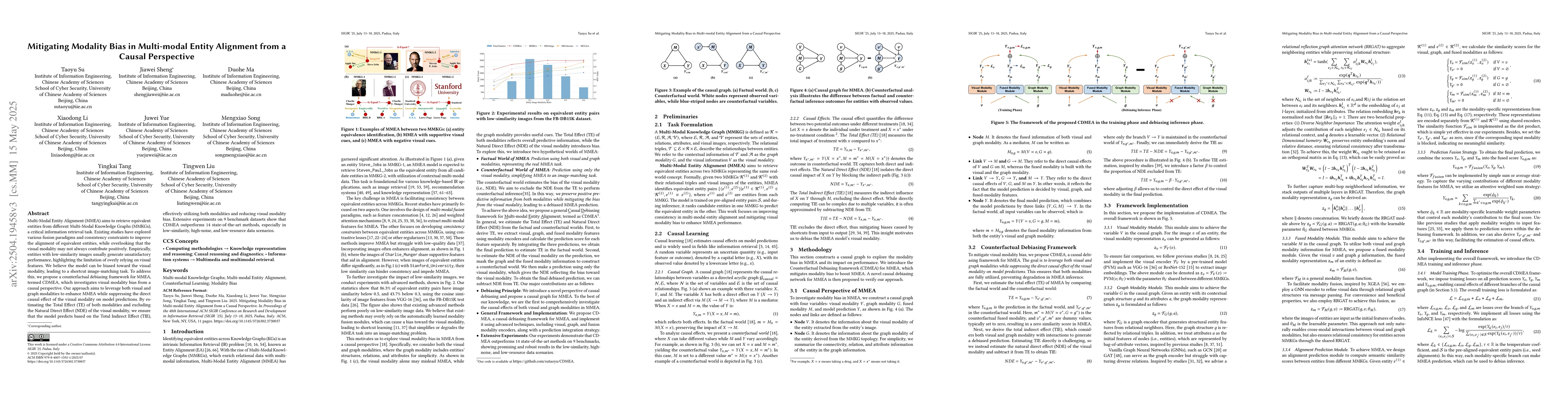 This research proposes a new framework called CDMEA to mitigate modality bias in multi-modal entity alignment, outperforming 14 state-of-the-art methods on 9 benchmark datasets.