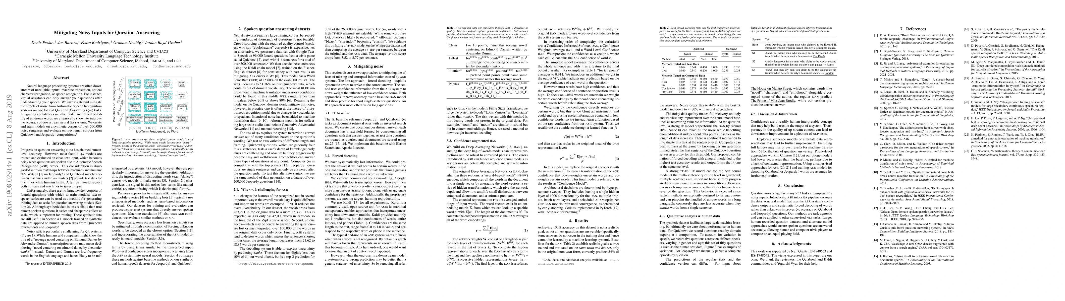 Natural language processing systems are often downstream of unreliable inputs: machine translation, optical character recognition, or speech recognition. For instance, virtual assistants can only answer your questions after understanding your speech. We investigate and mitigate the effects of noise from Automatic Speech Recognition systems on two factoid Question Answering (QA) tasks. Integrating confidences into the model and forced decoding of unknown words are empirically shown to improve the accuracy of downstream neural QA systems. We create and train models on a synthetic corpus of over 500,000 noisy sentences and evaluate on two human corpora from Quizbowl and Jeopardy! competitions.