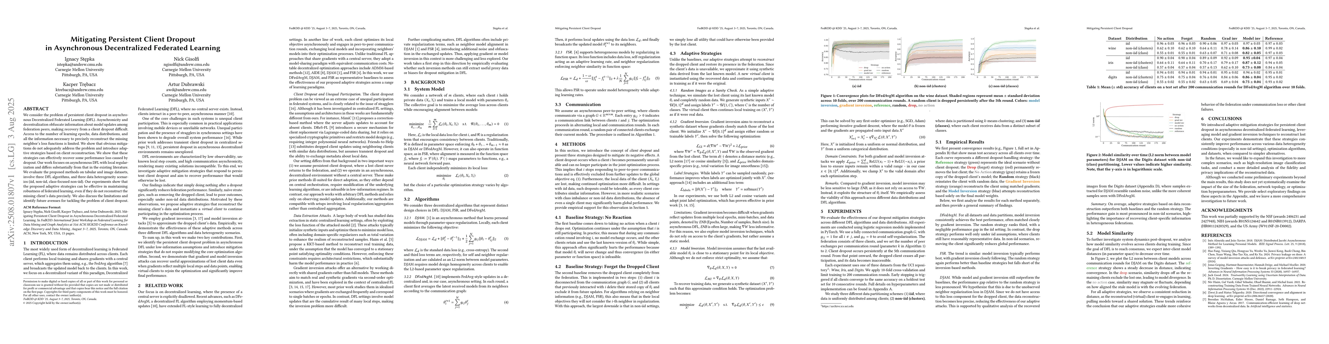 We consider the problem of persistent client dropout in asynchronous Decentralized Federated Learning (DFL). Asynchronicity and decentralization obfuscate information about model updates among federation peers, making recovery from a client dropout difficult. Access to the number of learning epochs, data distributions, and all the information necessary to precisely reconstruct the missing neighbor's loss functions is limited. We show that obvious mitigations do not adequately address the problem and introduce adaptive strategies based on client reconstruction. We show that these strategies can effectively recover some performance loss caused by dropout. Our work focuses on asynchronous DFL with local regularization and differs substantially from that in the existing literature. We evaluate the proposed methods on tabular and image datasets, involve three DFL algorithms, and three data heterogeneity scenarios (iid, non-iid, class-focused non-iid). Our experiments show that the proposed adaptive strategies can be effective in maintaining robustness of federated learning, even if they do not reconstruct the missing client's data precisely. We also discuss the limitations and identify future avenues for tackling the problem of client dropout.