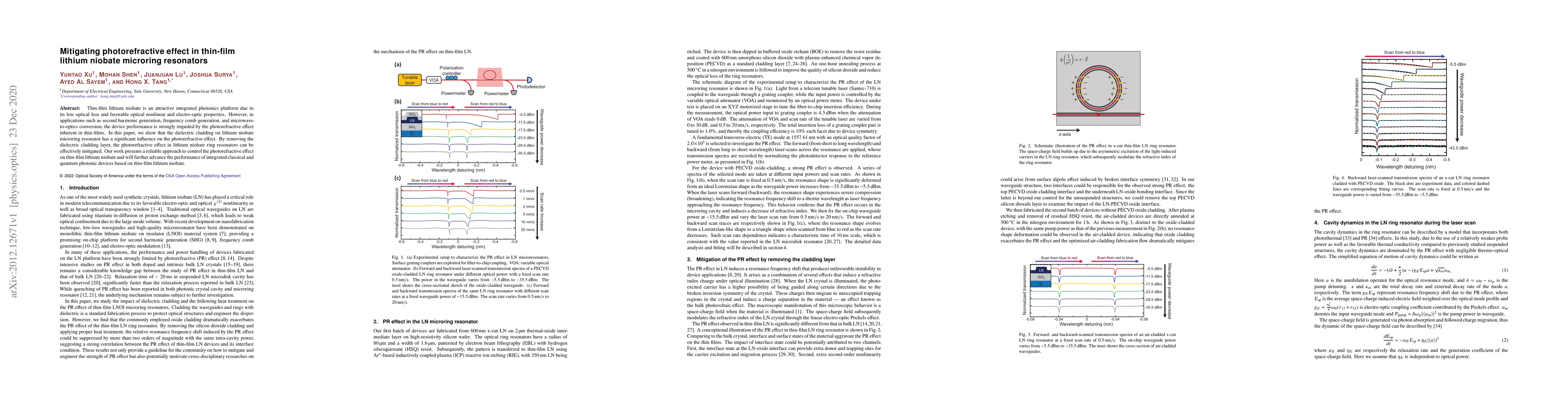 This research demonstrates that removing the dielectric cladding layer on lithium niobate microring resonators significantly mitigates the photorefractive effect, thereby enhancing device performance for applications like second harmonic generation and microwave-to-optics conversion. This approach provides a reliable method to control photorefractive effects in thin-film lithium niobate.