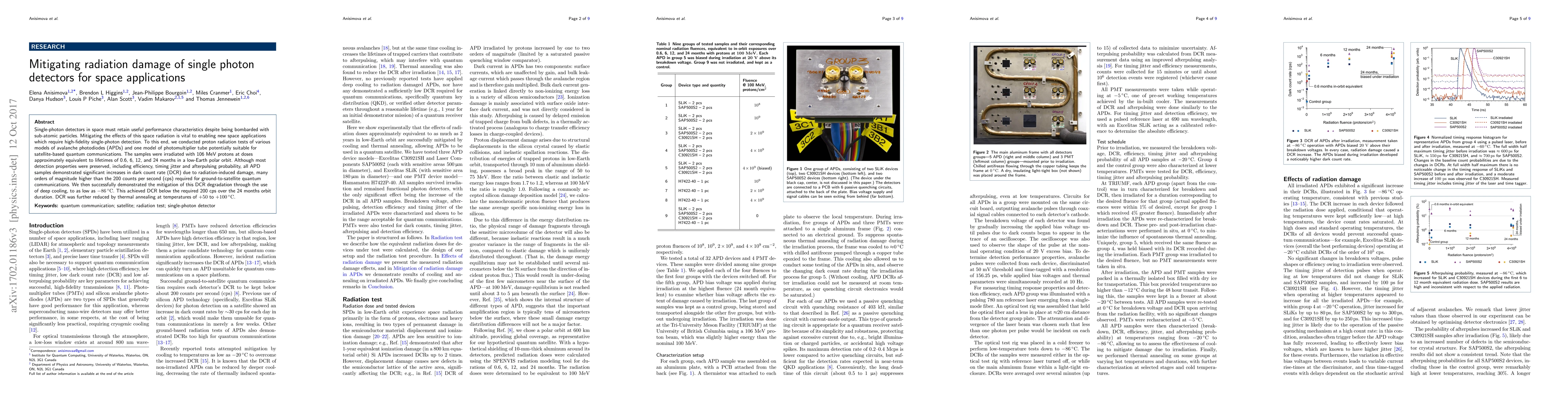 Single-photon detectors in space must retain useful performance characteristics despite being bombarded with sub-atomic particles. Mitigating the effects of this space radiation is vital to enabling new space applications which require high-fidelity single-photon detection. To this end, we conducted proton radiation tests of various models of avalanche photodiodes (APDs) and one model of photomultiplier tube potentially suitable for satellite-based quantum communications. The samples were irradiated with 106 MeV protons at doses approximately equivalent to lifetimes of 0.6 , 6, 12 and 24 months in a low-Earth polar orbit. Although most detection properties were preserved, including efficiency, timing jitter and afterpulsing probability, all APD samples demonstrated significant increases in dark count rate (DCR) due to radiation-induced damage, many orders of magnitude higher than the 200 counts per second (cps) required for ground-to-satellite quantum communications. We then successfully demonstrated the mitigation of this DCR degradation through the use of deep cooling, to as low as -86 degrees C. This achieved DCR below the required 200 cps over the 24 months orbit duration. DCR was further reduced by thermal annealing at temperatures of +50 to +100 degrees C.