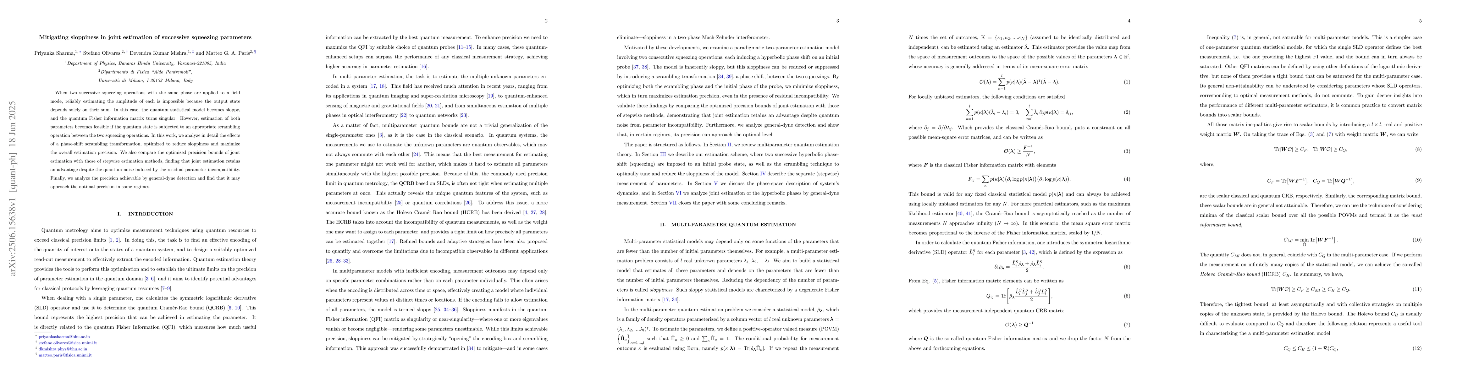 This research explores methods to improve the estimation of successive squeezing parameters in quantum systems, which traditionally suffer from 'sloppiness' due to their interdependence. By introducing a phase-shift scrambling transformation, the study demonstrates that joint estimation of parameters becomes feasible and can even surpass stepwise methods, despite quantum noise. The precision achievable through general-dyne detection is also analyzed, showing it can approach optimal precision in certain conditions.