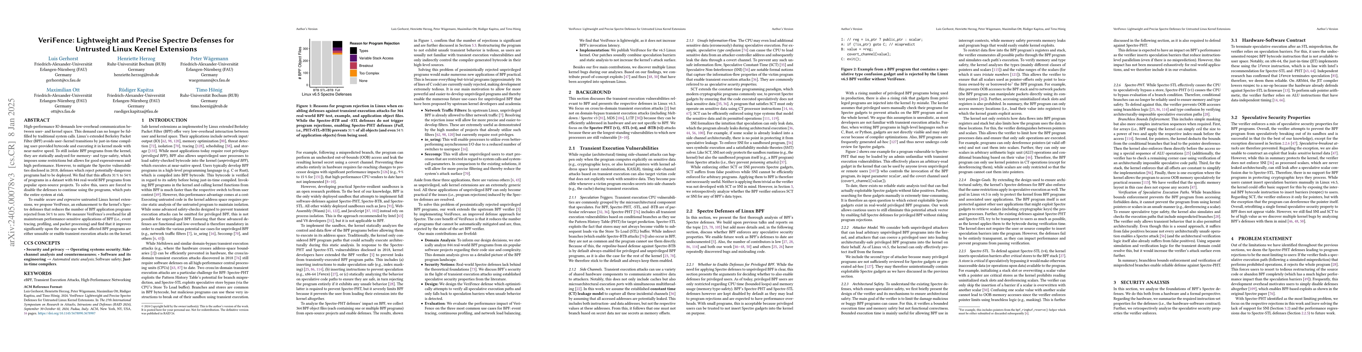 Unlike existing Spectre defenses that either reject BPF programs or introduce significant performance overhead, VeriFence dynamically inserts speculation barriers only when unsafe behavior is detected, allowing more BPF programs to be used securely with minimal performance impact.