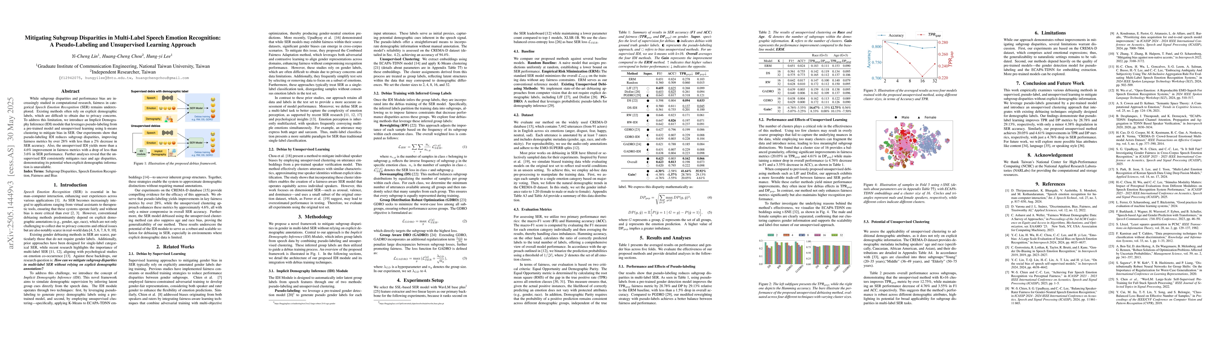 This work stands out by proposing a method to mitigate subgroup disparities in SER using implicit demographic information, contrasting with existing approaches that depend on explicit demographic labels.