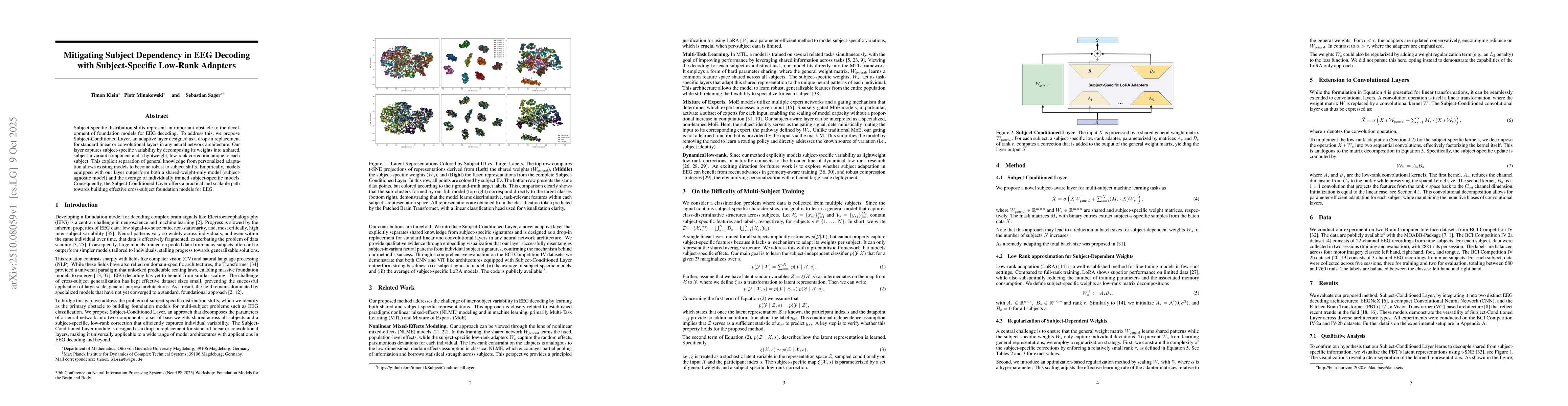 The work introduces a subject-conditioned layer that explicitly separates shared patterns from subject-specific variations using low-rank adapters, offering a scalable solution to subject dependency in EEG decoding that outperforms existing methods.