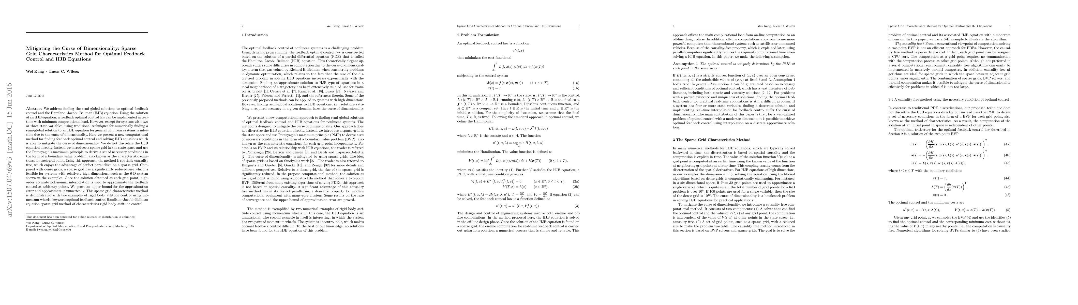 We address finding the semi-global solutions to optimal feedback control and the Hamilton--Jacobi--Bellman (HJB) equation. Using the solution of an HJB equation, a feedback optimal control law can be implemented in real-time with minimum computational load. However, except for systems with two or three state variables, using traditional techniques for numerically finding a semi-global solution to an HJB equation for general nonlinear systems is infeasible due to the curse of dimensionality. Here we present a new computational method for finding feedback optimal control and solving HJB equations which is able to mitigate the curse of dimensionality. We do not discretize the HJB equation directly, instead we introduce a sparse grid in the state space and use the Pontryagin's maximum principle to derive a set of necessary conditions in the form of a boundary value problem, also known as the characteristic equations, for each grid point. Using this approach, the method is spatially causality free, which enjoys the advantage of perfect parallelism on a sparse grid. Compared with dense grids, a sparse grid has a significantly reduced size which is feasible for systems with relatively high dimensions, such as the $6$-D system shown in the examples. Once the solution obtained at each grid point, high-order accurate polynomial interpolation is used to approximate the feedback control at arbitrary points. We prove an upper bound for the approximation error and approximate it numerically. This sparse grid characteristics method is demonstrated with two examples of rigid body attitude control using momentum wheels.