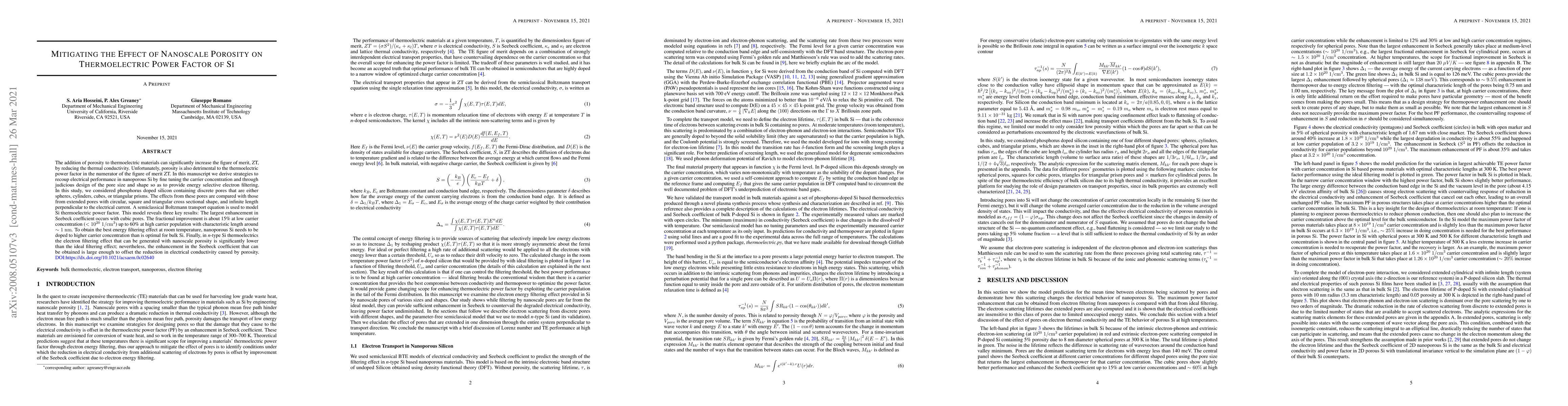 Researchers found that adding porosity to silicon can increase thermoelectric power, with cubic pores showing the largest enhancement of 15-60% at low-high carrier concentrations. The addition of porosity is beneficial despite reducing electrical conductivity.