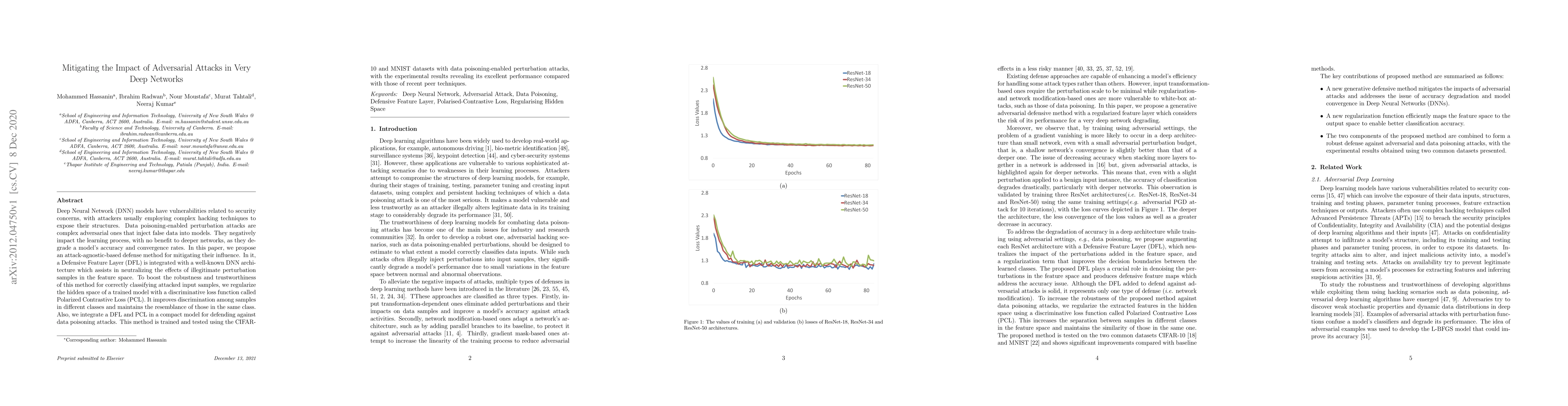Deep Neural Network (DNN) models have vulnerabilities related to security concerns, with attackers usually employing complex hacking techniques to expose their structures. Data poisoning-enabled perturbation attacks are complex adversarial ones that inject false data into models. They negatively impact the learning process, with no benefit to deeper networks, as they degrade a model's accuracy and convergence rates. In this paper, we propose an attack-agnostic-based defense method for mitigating their influence. In it, a Defensive Feature Layer (DFL) is integrated with a well-known DNN architecture which assists in neutralizing the effects of illegitimate perturbation samples in the feature space. To boost the robustness and trustworthiness of this method for correctly classifying attacked input samples, we regularize the hidden space of a trained model with a discriminative loss function called Polarized Contrastive Loss (PCL). It improves discrimination among samples in different classes and maintains the resemblance of those in the same class. Also, we integrate a DFL and PCL in a compact model for defending against data poisoning attacks. This method is trained and tested using the CIFAR-10 and MNIST datasets with data poisoning-enabled perturbation attacks, with the experimental results revealing its excellent performance compared with those of recent peer techniques.