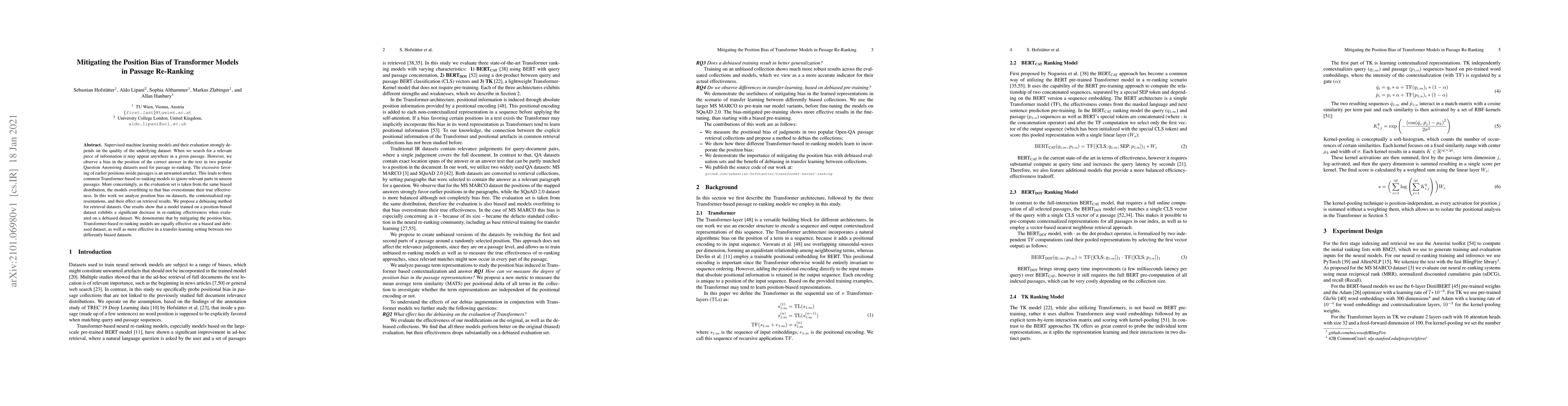 Researchers found that popular transformer models exhibit a position bias in passage re-ranking, favoring earlier positions and underperforming on debiased datasets. They propose a debiasing method to mitigate this bias, demonstrating improved performance on both biased and debiased datasets.