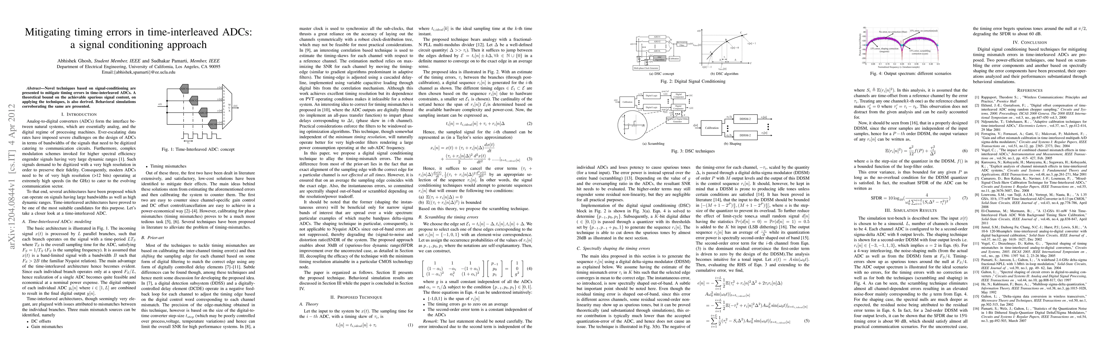 This paper proposes new techniques to reduce timing errors in time-interleaved ADCs, achieving a theoretical bound on spurious signal content, with behavioral simulations confirming the approach.